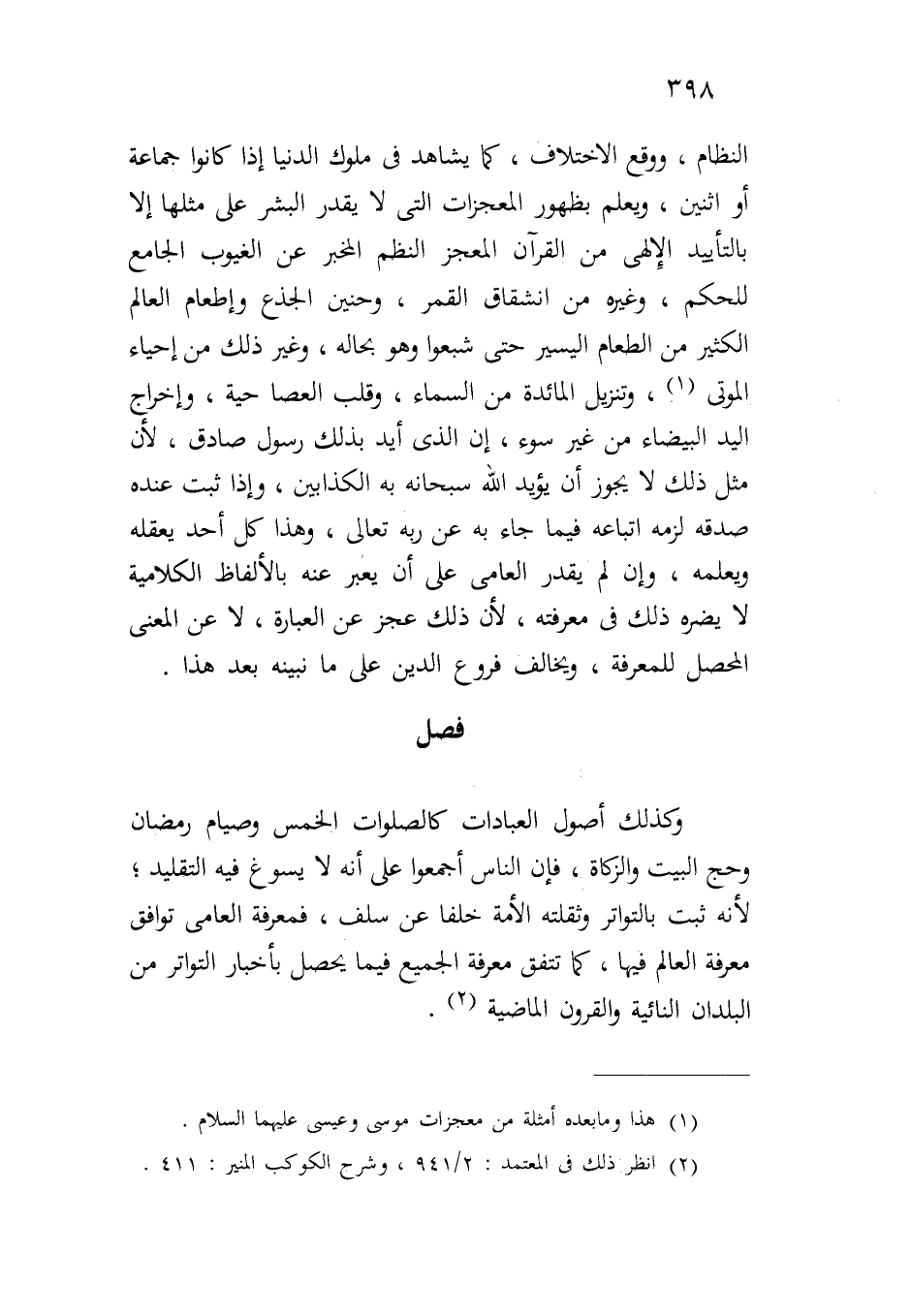 النظام، ووقع الاختلاف، كما يشاهد في ملوك الدنيا إذا كانوا جماعة أو اثنين، ويعلم بظهور المعجزات التي لا يقدر البشر على مثلها إلا بالتأييد الإلهي من القرآن المعجز النظم المخبر عن الغيوب الجامع للحكم، وغيره من انشقاق القمر، وحنين الجذع وإطعام العالم الكثير من الطعام اليسير حتى شبعوا وهو بحاله، وغير ذلك من إحياء الموتى، وتنزيل المائدة من السماء، وقلب العصا حية، وإخراج اليد البيضاء من غير سوء، إن الذي أيد بذلك رسول صادق، لأن مثل ذلك لا يجوز أن يؤيد الله سبحانه به الكذابين، وإذا ثبت عنده صدقه لزمه اتباعه فيما جاء به عن ربه تعالى، وهذا كل أحد يعقله ويعلمه، وإن لم يقدر العامي على أن يعبر عنه بالألفاظ الكلامية لا يضره ذلك في معرفته، لأن ذلك عجز عن العبارة، لا عن المعنى المحصل للمعرفة، ويخالف فروع الدين على ما نبينه بعد هذا.