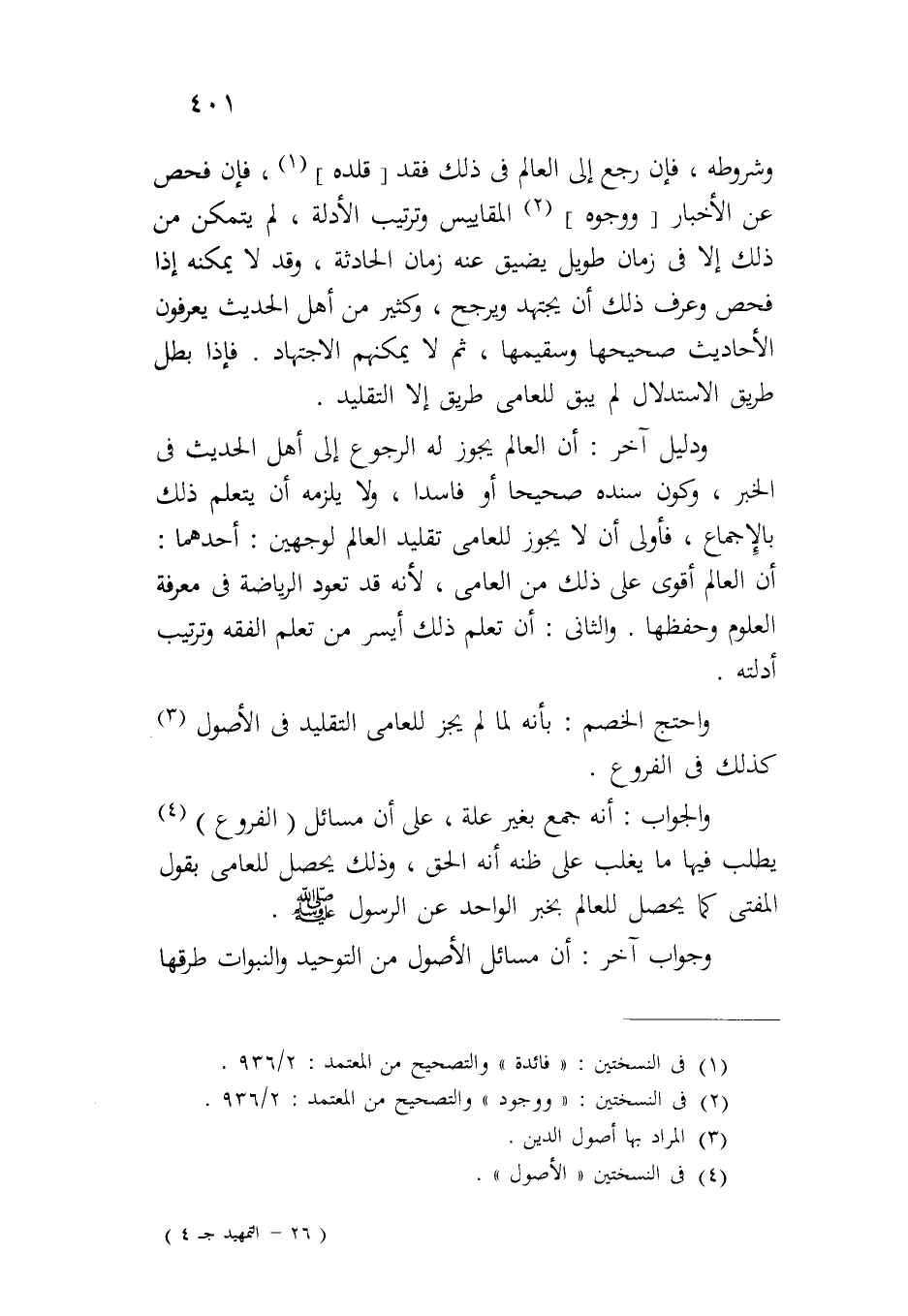 والجواب: أنه جمع بغير علة، على أن مسائل (الفروع) يطلب فيها ما يغلب على ظنه أنه الحق، وذلك يحصل للعامي بقول المفتي كما يحصل للعالم بخبر الواحد عن الرسول صلى الله عليه وسلم.