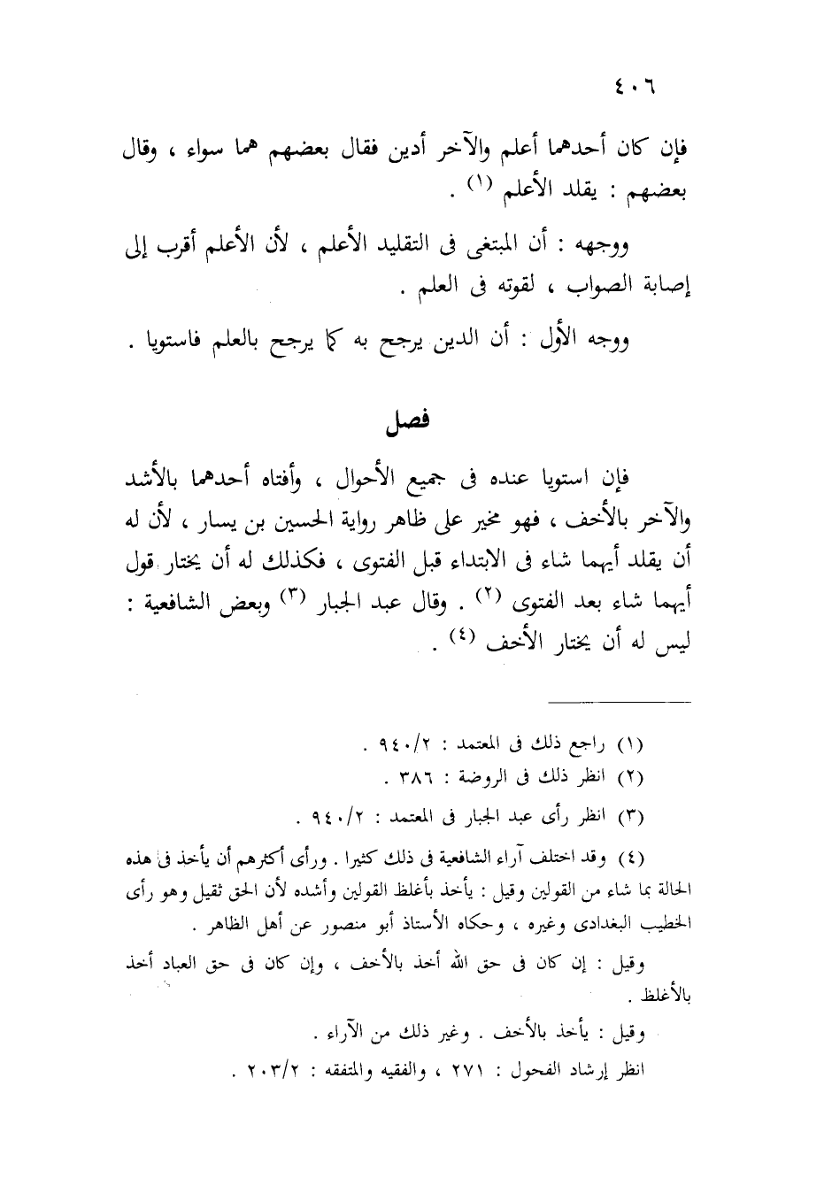 فإن استويا عنده في جميع الأحوال، وأفتاه أحدهما بالأشد والآخر بالأخف، فهو مخير على ظاهر رواية الحسين بن يسار، لأن له أن يقلد أيهما شاء في الابتداء قبل الفتوى، فكذلك له أن يختار قول أيهما شاء بعد الفتوى. وقال عبد الجبار وبعض الشافعية: ليس له أن يختار الأخف.
