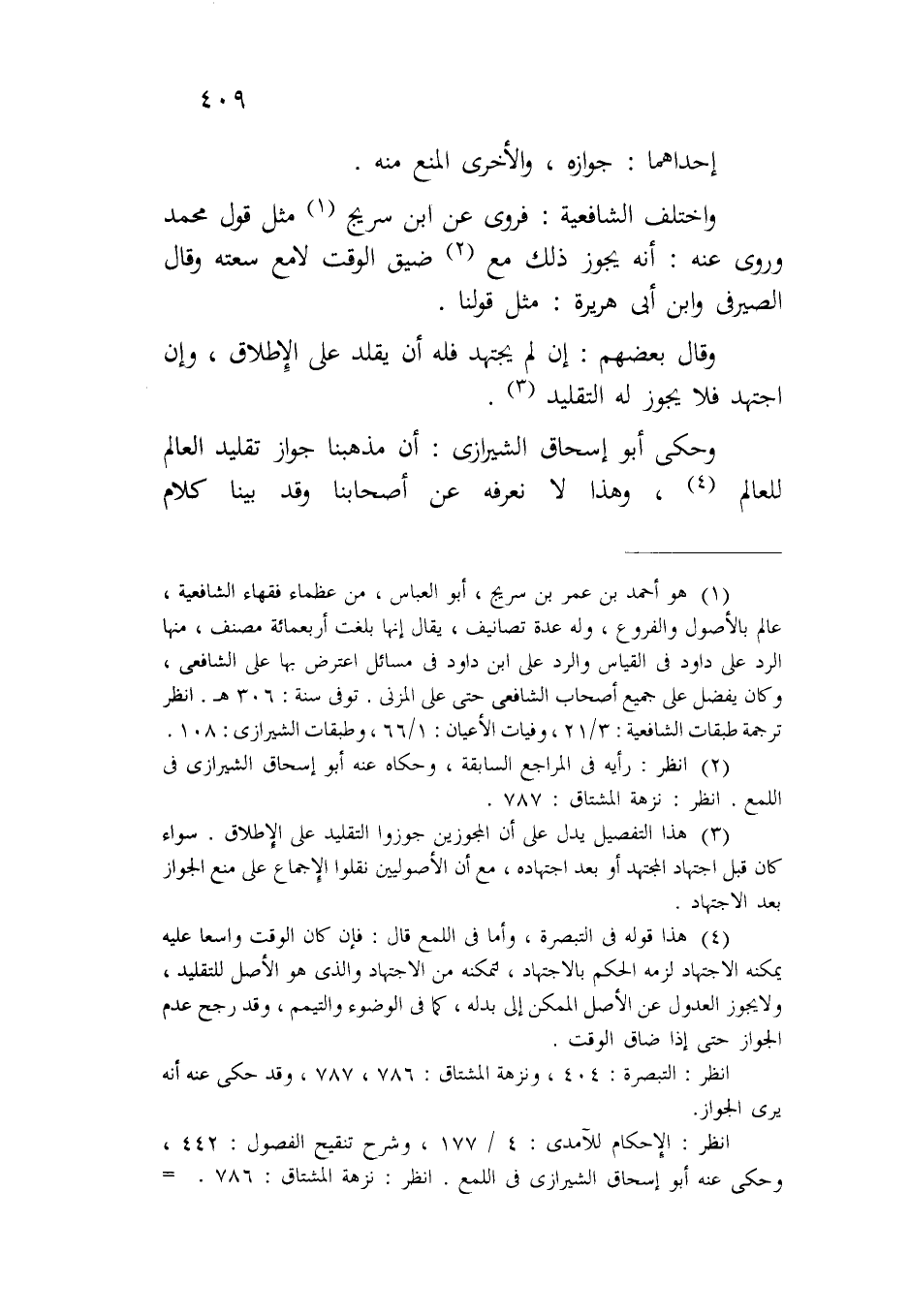 وحكى أبو إسحاق الشيرازي: أن مذهبنا جواز تقليد العالم للعالم، وهذا لا نعرفه عن أصحابنا وقد بينا كلام