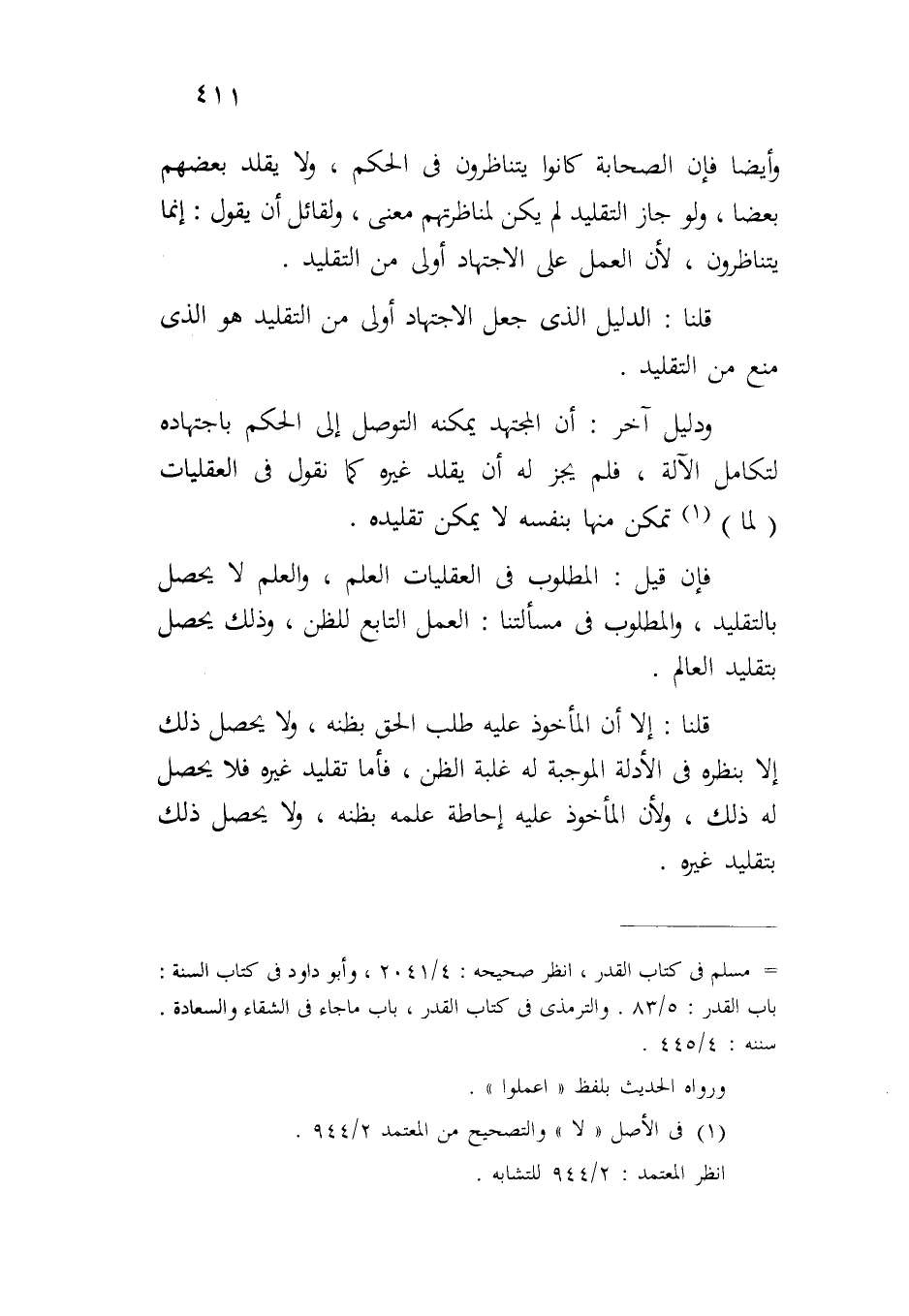 وأيضاً فإن الصحابة كانوا يتناظرون في الحكم، ولا يقلد بعضهم بعضاً، ولو جاز التقليد لم يكن لمناظرتهم معنى، ولقائل أن يقول: إنما يتناظرون، لأن العمل على الاجتهاد أولى من التقليد.