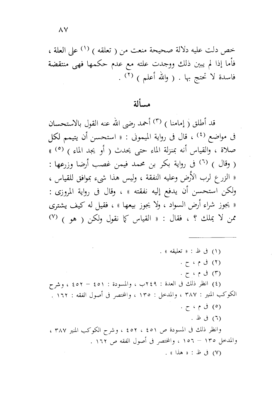 قد أطلق (إمامنا) أحمد رضي الله عنه القول بالاستحسان في مواضع، قال في رواية الميموني: "استحسن أن يتيمم لكل صلاة، والقياس أنه بمنزلة الماء حتى يحدث (أو يجد الماء) " (وقال) في رواية بكر بن محمد فيمن غصب أرضاً وزرعها: "الزرع لرب الأرض وعليه النفقة، وليس هذا شيء بموافق للقياس، ولكن استحسن أن يدفع إليه نفقته"، وقال في رواية المروزي: "يجوز شراء أرض السواد، ولا يجوز بيعها"، فقيل له كيف يشتري ممن لا يملك؟، فقال: "القياس كما نقول ولكن (هو)