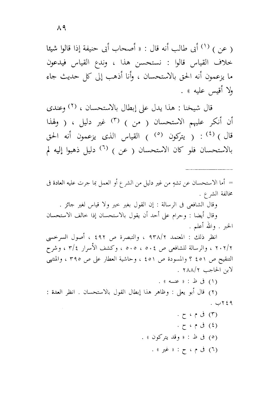 (عن) أبي طالب أنه قال: "أصحاب أبي حنيفة إذا قالوا شيئاً خلاف القياس قالوا: نستحسن هذا، وندع القياس فيدعون ما يزعمون أنه الحق بالاستحسان، وأنا أذهب إلى كل حديث جاء ولا أقيس عليه".