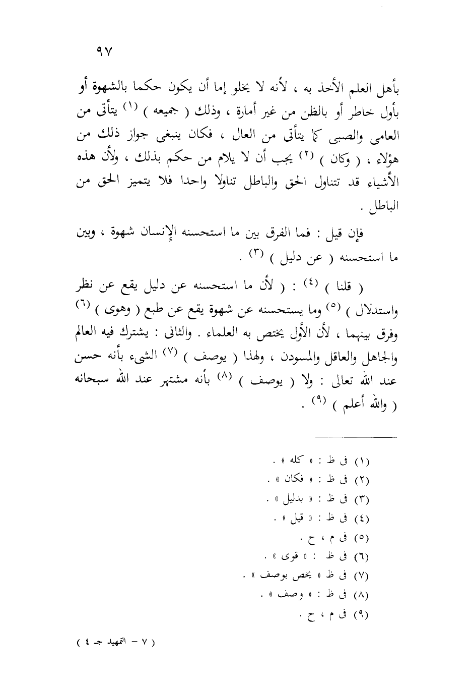 (قلنا): (لأن ما استحسنه عن دليل يقع عن نظر واستدلال) وما يستحسنه عن شهوة يقع عن طبع (وهوى) وفرق بينهما، لأن الأول يختص به العلماء. والثاني: يشترك فيه العالم والجاهل والعاقل والمسودن، ولهذا (يوصف) الشيء بأنه حسن عند الله تعالى: (ولا (يوصف) بأنه مشتهر عند الله سبحانه (والله أعلم).