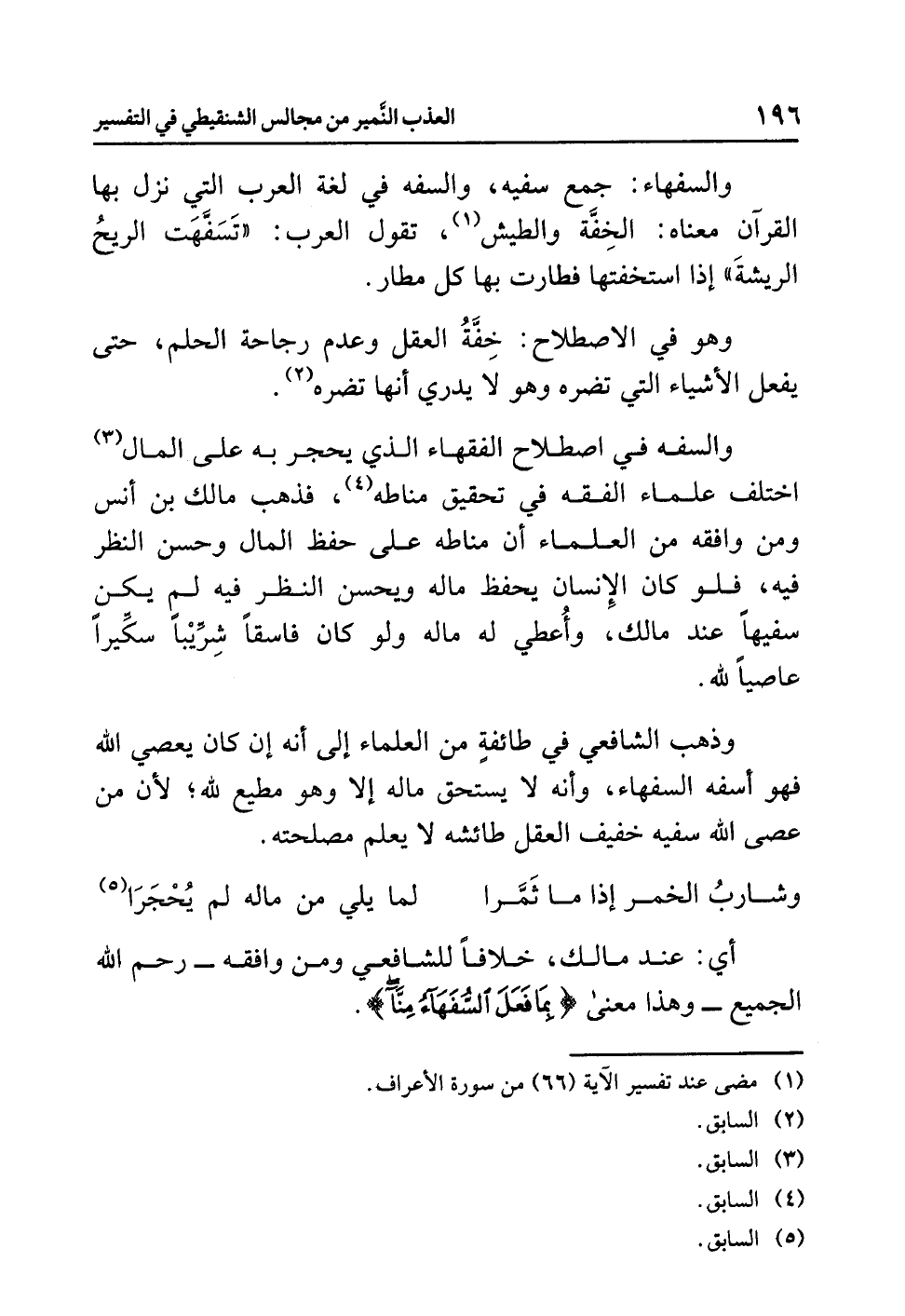والسفه في اصطلاح الفقهاء الذي يحجر به على المال (¬3) اختلف علماء الفقه في تحقيق مناطه (¬4)، فَذَهَبَ مالك بن أنس ومَنْ وَافقَهُ من العلماء أن مناطه على حفظ المال وحسن النظر فيه، فلو كان الإنسان يحفظ ماله ويحسن النظر فيه لم يكن سفيهًا عند مالك، وأُعطي له ماله ولو كان فاسقًا شِرِّيبًا سكِّيرًا عاصيًا لله.