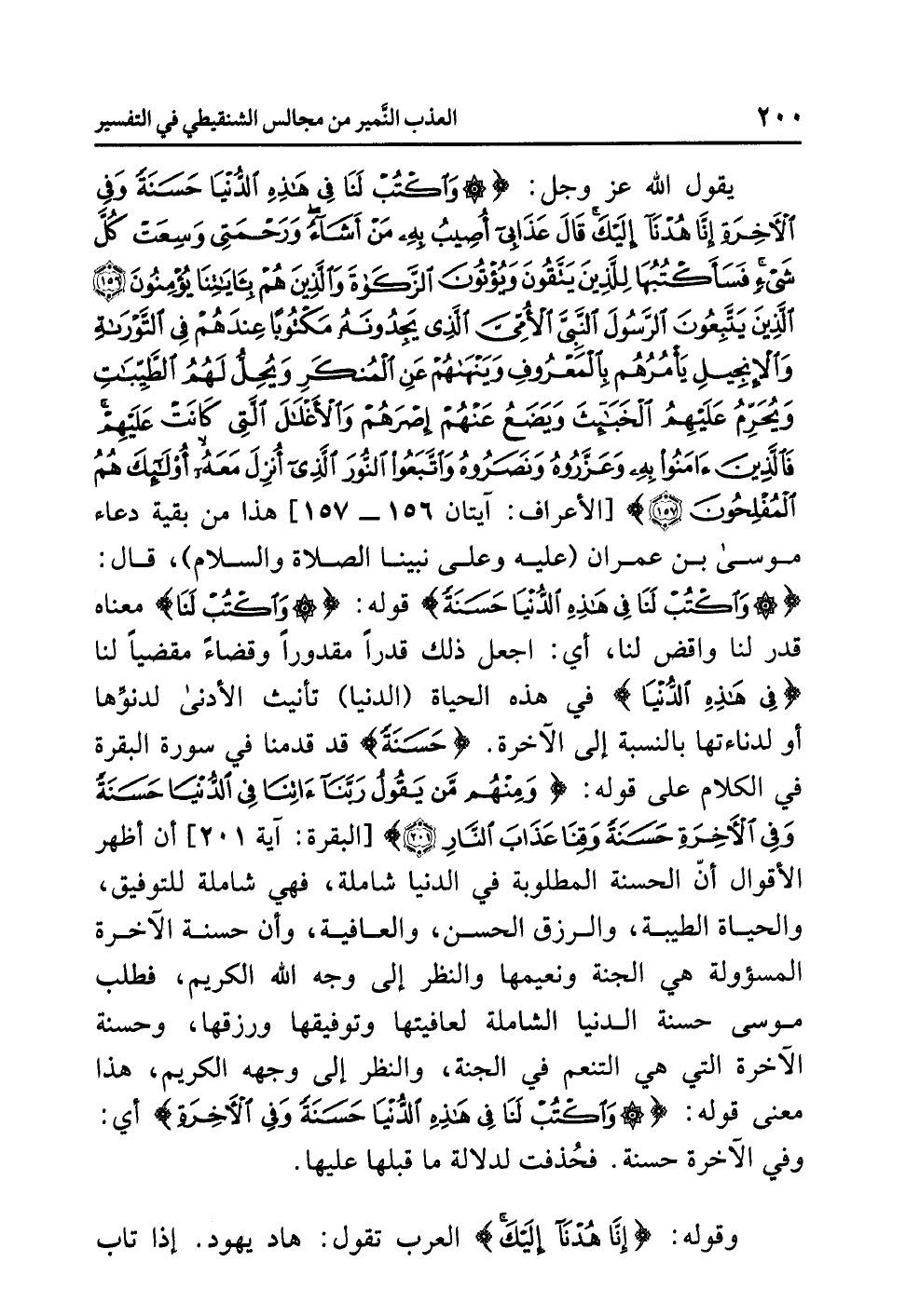 يقول الله عز وجل: {وَاكْتُبْ لَنَا فِي هَذِهِ الدُّنْيَا حَسَنَةً وَفِي الآخِرَةِ إِنَّا هُدْنَا إِلَيْكَ قَالَ عَذَابِي أُصِيبُ بِهِ مَنْ أَشَاء وَرَحْمَتِي وَسِعَتْ كُلَّ شيء فَسَأَكْتُبُهَا لِلَّذِينَ يَتَّقُونَ وَيُؤْتُونَ الزَّكَاةَ وَالَّذِينَ هُم بِآيَاتِنَا يُؤْمِنُونَ (156) الَّذِينَ يَتَّبِعُونَ الرَّسُولَ النَّبِيَّ الأُمِّيَّ الَّذِي يَجِدُونَهُ مَكْتُوبًا عِندَهُمْ فِي التَّوْرَاةِ وَالإِنْجِيلِ يَأْمُرُهُم بِالْمَعْرُوفِ وَيَنْهَاهُمْ عَنِ الْمُنكَرِ وَيُحِلُّ لَهُمُ الطَّيِّبَاتِ وَيُحَرِّمُ عَلَيْهِمُ الْخَبَآئِثَ وَيَضَعُ عَنْهُمْ إِصْرَهُمْ وَالأَغْلاَلَ الَّتِي كَانَتْ عَلَيْهِمْ فَالَّذِينَ آمَنُواْ بِهِ وَعَزَّرُوهُ وَنَصَرُوهُ وَاتَّبَعُواْ النُّورَ الَّذِيَ أُنزِلَ مَعَهُ أُوْلَئِكَ هُمُ الْمُفْلِحُونَ (157)} هذا من بقية دعاء موسى بن عمران (عليه وعلى نبينا الصلاة والسلام)، قال: {وَاكْتُبْ لَنَا فِي هَذِهِ الدُّنْيَا حَسَنَةً} قوله: {وَاكْتُبْ لَنَا} معناه قدر لنا واقض لنا، أي: اجعل ذلك قدرًا مقدورًا وقضاءً مقضيًّا لنا {فِي هَذِهِ الدُّنْيَا} في هذه الحياة (الدنيا) تأنيث الأدنى لدنوِّها أو لدناءتها بالنسبة إلى الآخرة. {حَسَنَةً} قد قدمنا في سورة البقرة في الكلام على قوله: {وِمِنْهُم مَّن يَقُولُ رَبَّنَا آتِنَا فِي الدُّنْيَا حَسَنَةً وَفِي الآخِرَةِ حَسَنَةً وَقِنَا عَذَابَ النَّارِ (201)} [البقرة: آية 201] أن أظهر الأقوال أنّ الحسنة المطلوبة في الدنيا شاملة، فهي شاملة للتوفيق، والحياة الطيبة، والرزق الحسن، والعافية، وأن حسنة الآخرة المسئولة هي الجنة ونعيمها والنظر إلى وجه الله الكريم، فطلب موسى حسنة الدنيا الشاملة لعافيتها وتوفيقها ورزقها، وحسنة الآخرة التي هي التَّنَعُّمُ في الجَنَّةِ، والنَّظَر إلى وجْهِهِ الكَرِيمِ، هذا معنى قوله: {وَاكْتُبْ لَنَا فِي هَذِهِ الدُّنْيَا حَسَنَةً وَفِي الآخِرَةِ} أي: وفي الآخرة حسنة. فحُذفت لدلالة ما قبلها عليها.