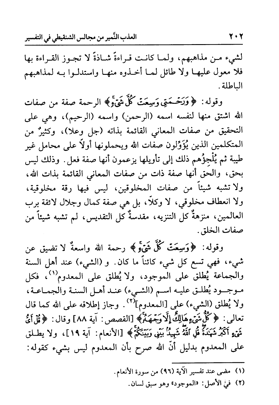 وقوله: {وَسِعَتْ كُلَّ شيء} رحمة الله واسعةٌ لا تضيق عن شيء، فهي تسع كل شيء كائنًا ما كان. و (الشيء) عند أهل السنة والجماعة يُطلق على الموجود، ولا يُطلق على المعدوم (¬1)، فكل موجود يُطلق عليه اسم (الشيء) عند أهل السنة والجماعة، ولا يُطلق (الشيء) على [المعدوم] (¬2). وجاز إطلاقه على الله كما قال تعالى: {كُلُّ شَيْءٍ هَالِكٌ إِلاَّ وَجْهَهُ} [القصص: آية 88] وقال: {قُلْ أَيُّ شَيْءٍ أَكْبَرُ شَهَادةً قُلِ اللَّهُ شَهِيدٌ بِيْنِي وَبَيْنَكُمْ} [الأنعام: آية 19]، ولا يطلق على المعدوم بدليل أنّ الله صرح بأن المعدوم ليس بشيء كقوله: