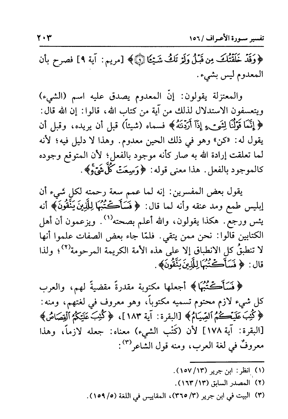 والمعتزلة يقولون: إنّ المعدوم يصدق عليه اسم (الشيء) ويتعسفون الاستدلال لذلك من آية من كتاب الله، قالوا: إن الله قال: {إِنَّمَا قَوْلُنَا لِشيء إِذَا أَرَدْنَاهُ} فسماه (شيئًا) قبل أن يريده، وقبل أن يقول له: «كن» وهو في ذلك الحين معدوم. وهذا لا دليل فيه؛ لأنه لما تعلقت إرادة الله به صار كأنه موجود بالفعل؛ لأن المتوقع وجوده كالموجود بالفعل. هذا معنى قوله: {وَسِعَتْ كُلَّ شيء}.