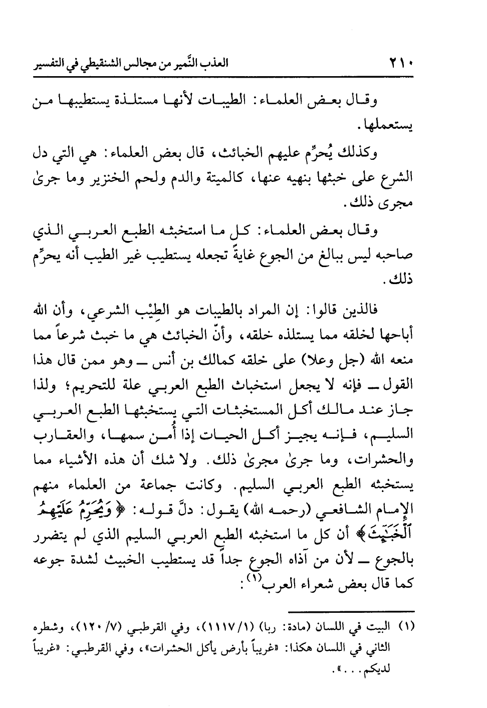 فالذين قالوا: إن المراد بالطيبات هو الطيب الشرعي، وأن الله أباحها لخلقه مما يستلذه خلقه، وأنّ الخبائث هي ما خبث شرعًا مما منعه الله (جل وعلا) على خلقه كمالك بن أنس - وهو ممن قال هذا القول- فإنه لا يجعل استخباث الطبع العربي علة للتحريم؛ ولذا جاز عند مالك أكل المستخبثات التي يستخبثها الطبع العربي السليم، فإنه يجيز أكل الحيات إذا أُمن سمها، والعقارب والحشرات، وما جرى مجرى ذلك. ولا شك أن هذه الأشياء مما يستخبثه الطبع العربي السليم. وكانت جماعة من العلماء منهم الإمام الشافعي (رحمه الله) يقول: دلَّ قوله: {وَيُحَرِّمُ عَلَيْهِمُ الْخَبَآئِثَ} أن كل ما استخبثه الطبع العربي السليم الذي لم يتضرر بالجوع- لأن مَنْ آذاه الجوع جِدًّا قد يستطيب الخبيث لشدة جوعه كما قال بعض شعراء العرب (¬1):
