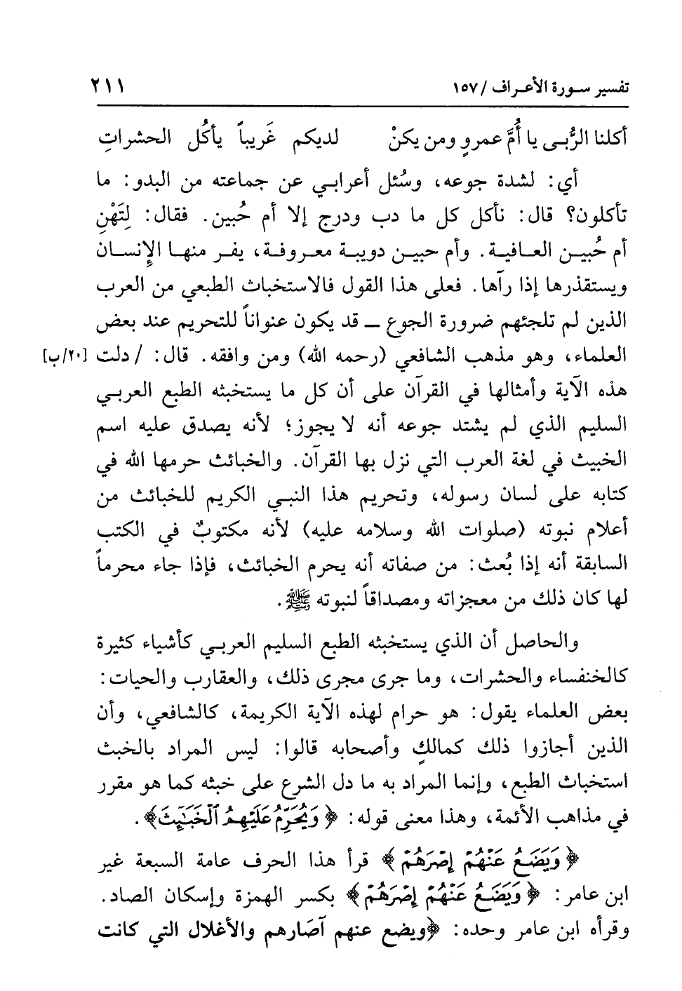 والحاصل أن الذي يستخبثه الطبع السليم العربي كأشياء كثيرة كالخنفساء والحشرات، وما جرى مجرى ذلك، والعقارب والحيات: بعض العلماء يقول: هو حرام لهذه الآية الكريمة، كالشافعي، وأن الذين أجازوا ذلك كمالكٍ وأصحابه قالوا: ليس المراد بالخبث استخباث الطبع، وإنما المراد به ما دَلَّ الشرع على خبْثِهِ كما هو مُقَرَّرٌ في مذاهب الأئمة، وهذا معنى قوله: {وَيُحَرِّمُ عَلَيْهِمُ الْخَبَآئِثَ}.