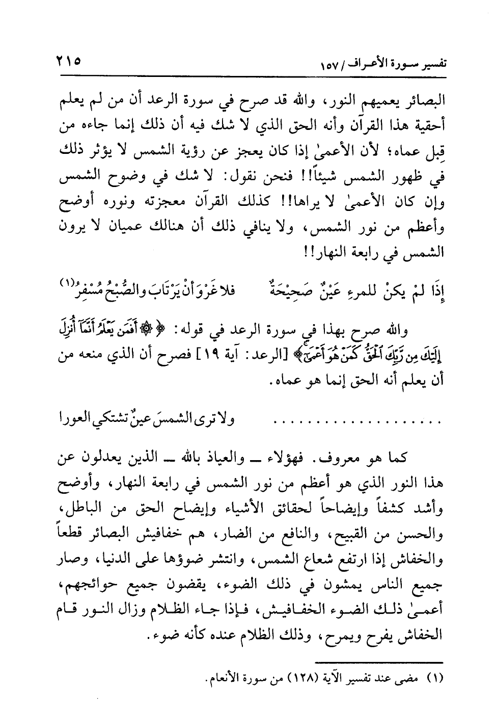 البصائر يعميهم النور، والله قد صرح في سورة الرعد أن من لم يعلم أحقية هذا القرآن وأنه الحق الذي لا شك فيه أن ذلك إنما جاءه من قِبل عماه؛ لأن الأعمى إذا كان يعجز عن رؤية الشمس لا يؤثر ذلك في ظهور الشمس شيئًا!! فنحن نقول: لا شك في وضوح الشمس وإن كان الأعمى لا يراها!! كذلك القرآن معجزته ونوره أوضح وأعظم من نور الشمس، ولا ينافي ذلك أن هنالك عميانًا لا يرون الشمس في رابعة النهار!!