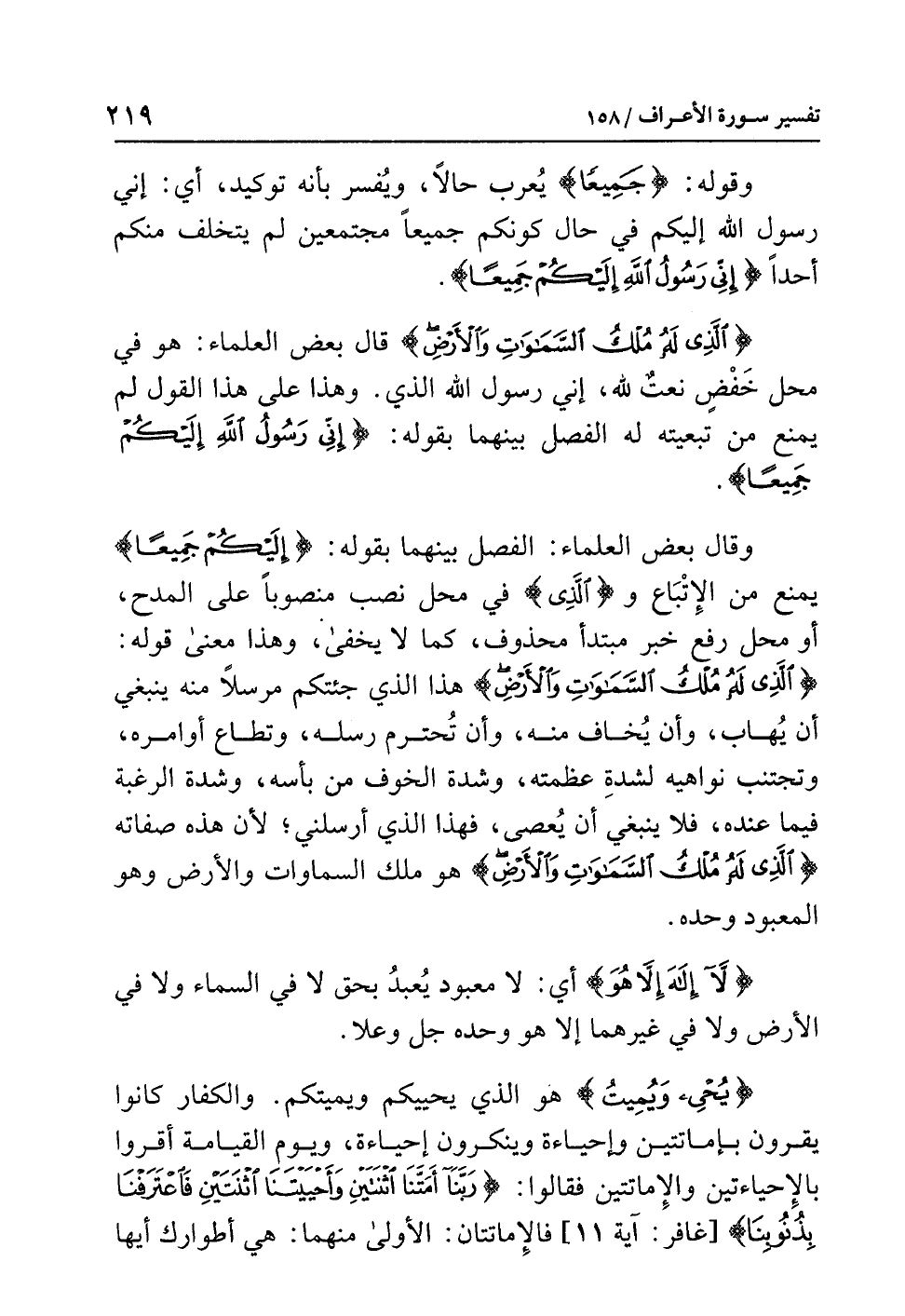 وقال بعض العلماء: الفصل بينهما بقوله: {إِلَيْكُمْ جَمِيعًا} يمنع من الإتباع و {الَّذِي} في محل نصب منصوبًا على المدح، أو محل رفع خبر مبتدأ محذوف، كما لا يخفى، وهذا معنى قوله: {الَّذِي لَهُ مُلْكُ السَّمَاوَاتِ وَالأَرْضِ} هذا الذي جئتكم مرسلاً منه ينبغي أن يُهاب، وأن يُخاف منه، وأن تُحترم رسله، وتُطاع أوامره، وتجتنب نواهيه لشدةِ عظمته، وشدة الخوف من بأسه، وشدة الرغبة فيما عنده، فلا ينبغي أن يُعصى، فهذا الذي أرسلني؛ لأن هذه صفاته {الَّذِي لَهُ مُلْكُ السَّمَاوَاتِ وَالأَرْضِ} هو ملك السماوات والأرض وهو المعبود وحده.