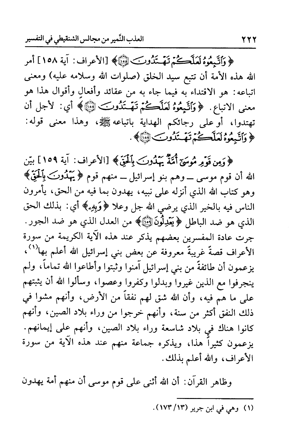 {وَمِن قَوْمِ مُوسَى أُمَّةٌ يَهْدُونَ بِالْحَقِّ} [الأعراف: آية 159] بيّن الله أن قوم موسى -وهم بنو إسرائيل- منهم قوم {يَهْدُونَ بِالْحَقِّ} وهو كتاب الله الذي أنزله على نبيه، يهدون بما فيه من الحق، يأمرون الناس فيه بالخير الذي يرضي الله جل وعلا {وَبِهِ} أي: بذلك الحق الذي هو ضد الباطل {يَعْدِلُونَ} من العدل الذي هو ضد الجور. جرت عادة المفسرين بعضهم يذكر عند هذه الآية الكريمة من سورة الأعراف قصةً غريبةً معروفة عن بعض بني إسرائيل الله أعلم بها (¬1)، يزعمون أن طائفة من بني إسرائيل آمنوا وثبتوا وأطاعوا الله تمامًا، ولم ينجرفوا مع الذين غَيَّرُوا وبَدَّلُوا وكفروا وعصوا، وسألوا الله أن يثبتهم على ما هم فيه، وأن الله شق لهم نفقًا من الأرض، وأنهم مشوا في ذلك النفق أكثر من سنة، وأنهم خرجوا من وراء بلاد الصين، وأنهم كانوا هناك في بلاد شاسعة وراء بلاد الصين، وأنهم على إيمانهم، يزعمون كثيرًا هذا، ويذكره جماعة منهم عند هذه الآية من سورة الأعراف، والله أعلم بذلك.