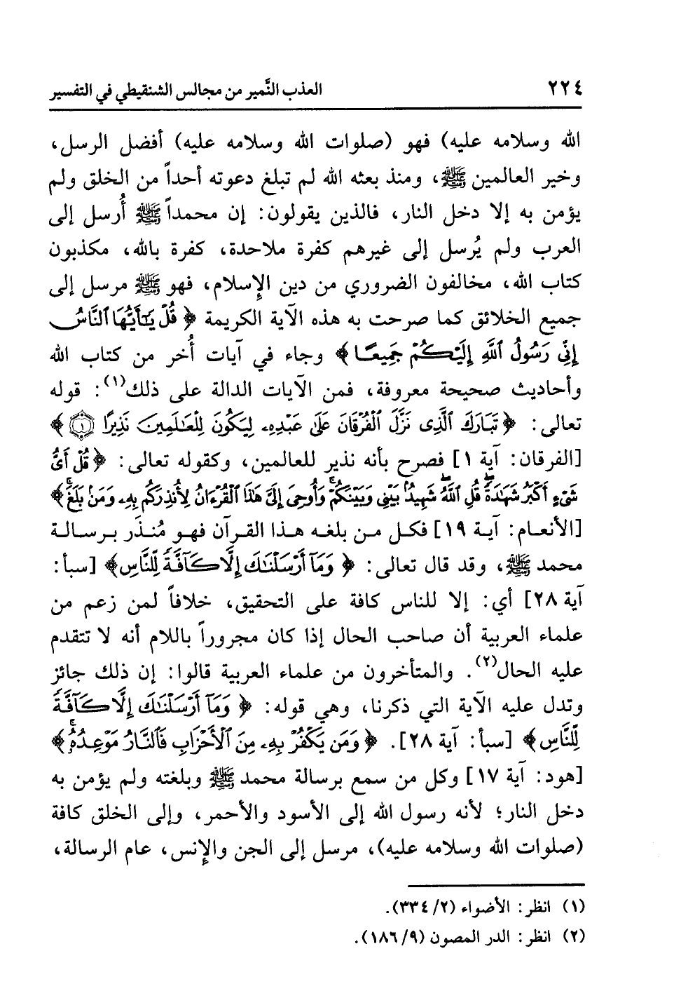 الله وسلامه عليه) فهو (صلوات الله وسلامه عليه) أفضل الرسل، وخير العالمين صلى الله عليه وسلم، ومنْذُ بَعَثَهُ الله لم تبلغ دعوته أحدًا من الخلق ولم يؤمن به إلا دخل النار، فالذين يقولون: إن محمدًا صلى الله عليه وسلم أُرسل إلى العرب ولم يُرسل إلى غَيْرِهم كفرة ملاحدة، كفرة بالله، مكذبون كتاب الله، مخالفون الضروري من دين الإسلام، فهو صلى الله عليه وسلم مرسل إلى جميع الخلائق كما صرحت به هذه الآية الكريمة {قُلْ يَا أَيُّهَا النَّاسُ إِنِّي رَسُولُ اللَّهِ إِلَيْكُمْ جَمِيعًا} وجاء في آيات أُخر من كتاب الله وأحاديث صحيحة معروفة، فمن الآيات الدالة على ذلك (¬1): قوله تعالى: {تَبَارَكَ الَّذِي نَزَّلَ الْفُرْقَانَ عَلَى عَبْدِهِ لِيَكُونَ لِلْعَالَمِينَ نَذِيرًا (1)} [الفرقان: آية 1] فصرح بأنه نذير للعالمين، وكقوله تعالى: {قُلْ أَيُّ شَيْءٍ أَكْبَرُ شَهَادةً قُلِ اللَّهُ شَهِيدٌ بِيْنِي وَبَيْنَكُمْ وَأُوحِيَ إِلَيَّ هَذَا الْقُرْآنُ لأُنذِرَكُم بِهِ وَمَن بَلَغَ} [الأنعام: آية 19] فكُلّ مَنْ بَلَغَهُ هَذَا القرآن فهو مُنْذَرٌ بِرِسَالَةِ محمَّدٍ صلى الله عليه وسلم، وقد قال تعالى: {وَمَا أَرْسَلْنَاكَ إِلاَّ كَافَّةً لِّلنَّاسِ} [سبأ: آية 28] أي: إلا للناس كافة على التحقيق، خلافًا لمَنْ زَعَمَ من علماء العربية أن صاحب الحال إذا كان مجرورًا باللام أنه لا تتقدم عليه الحال (¬2).