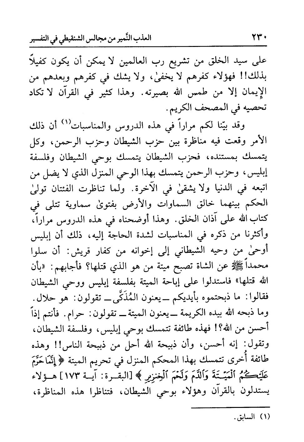 وقد بيّنا لكم مرارًا في هذه الدروس والمناسبات (¬1) أن ذلك الأمر وقعت فيه مناظرة بين حزب الشيطان وحزب الرحمن، وكل يتمسك بمستنده، فحزب الشيطان يتمسك بوحي الشيطان وفلسفة إبليس، وحزْب الرَّحْمَن يَتَمَسَّكُ بهذا الوحي المُنَزَّل الذي لا يَضِلُّ مَنِ اتَّبَعَهُ في الدنيا ولا يشقى في الآخرة. ولما تناظرت الفئتان تَوَلَّى الحكم بينهما خالق السَّمَاوَاتِ والأرض بفتوى سماوية تُتْلَى في كتاب الله على آذان الخلق. وهذا أوضحناه في هذه الدروس مرارًا، وأكثرنا مِنْ ذِكْرِه في المناسبات لشدة الحاجة إليه، ذلك أن إبليس أوحى من وحيه الشيطاني إلى إخوانه مِنْ كُفَّارِ قُرَيْشٍ: أن سلوا محمدًا صلى الله عليه وسلم عن الشاة تصبح ميتة من هو الذي قتلها؟ فأجابهم: «بأن الله قتلها» فاستدلوا على إباحة الميتة بفلسفة إبليس ووحي الشيطان فقالوا: ما ذبحتموه بأيديكم -يعنون المُذَكَّى- تقولون: هو حلال، وما ذبحه الله بيده الكريمة -يعنون الميتة- تقولون: حرام. فأنتم إذًا أحسن من الله؟! فهذه طائفة تتمسك بوحي إبليس، وفلسفة الشيطان، وتقول: إنه أحسن، وأن ذبيحة الله أحل من ذبيحة الناس!! وهذه طائفة أُخرى تتمسك بهذا المحكم المنَزّل في تحريم الميتة {إِنَّمَا حَرَّمَ عَلَيْكُمُ الْمَيْتَةَ وَالدَّمَ وَلَحْمَ الْخِنزِيرِ} [البقرة: آية 173] هؤلاء يستدلون بالقرآن وهؤلاء بوحي الشيطان، فتناظرا هذه المناظرة،