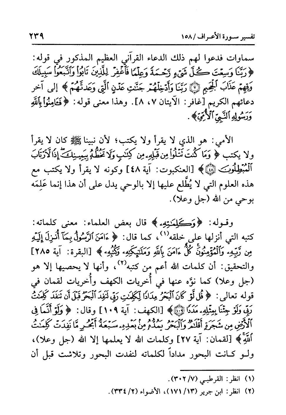 وقوله: {وَكَلِمَاتِهِ} قال بعض العلماء: معنى كلماته: كتبه التي أنزلها على خلقه (¬1)، كما قال: {آمَنَ الرَّسُولُ بِمَا أُنزِلَ إِلَيْهِ مِن رَّبِّهِ وَالْمُؤْمِنُونَ كُلٌّ آمَنَ بِاللَّهِ وَمَلآئِكَتِهِ وَكُتُبِهِ} [البقرة: آية 285] والتحقيق: أن كلمات الله أعم من كتبه (¬2)، وأنها لا يحصيها إلا هو (جل وعلا) كما نوَّه عنها في أُخريات الكهف وأُخريات لقمان في قوله تعالى: {قُل لَّوْ كَانَ الْبَحْرُ مِدَادًا لِّكَلِمَاتِ رَبِّي لَنَفِدَ الْبَحْرُ قَبْلَ أَن تَنفَدَ كَلِمَاتُ رَبِّي وَلَوْ جِئْنَا بِمِثْلِهِ مَدَدًا (109)} [الكهف: آية 109] وقال: {وَلَوْ أَنَّمَا فِي الأَرْضِ مِن شَجَرَةٍ أَقْلاَمٌ وَالْبَحْرُ يَمُدُّهُ مِن بَعْدِهِ سَبْعَةُ أَبْحُرٍ مَّا نَفِدَتْ كَلِمَاتُ اللَّهِ} [لقمان: آية 27] وكلمات الله لا يعلمها إلا الله (جل وعلا)، ولو كانت البحور مدادًا لكلماته لنفدت البحور وتلاشت قبل أن