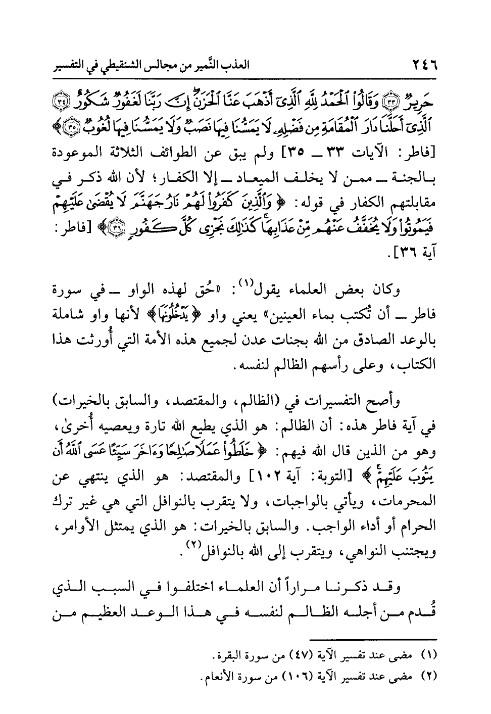 وأصح التفسيرات في (الظالم، والمقتصد، والسابق بالخيرات) في آية فاطر هذه: أن الظالم: هو الذي يطيع الله تارة ويعصيه أُخرى، وهو من الذين قال الله فيهم: {خَلَطُواْ عَمَلاً صَالِحًا وَآخَرَ سَيِّئًا عَسَى اللَّهُ أَن يَتُوبَ عَلَيْهِمْ} [التوبة: آية 102] والمقتصد: هو الذي ينتهي عن المحرمات، ويأتي بالواجبات، ولا يتقرب بالنوافل التي هي غير ترك الحرام أو أداء الواجب. والسابق بالخيرات: هو الذي يمتثل الأوامر، ويجتنب النواهي، ويتقرب إلى الله بالنوافل (¬2).