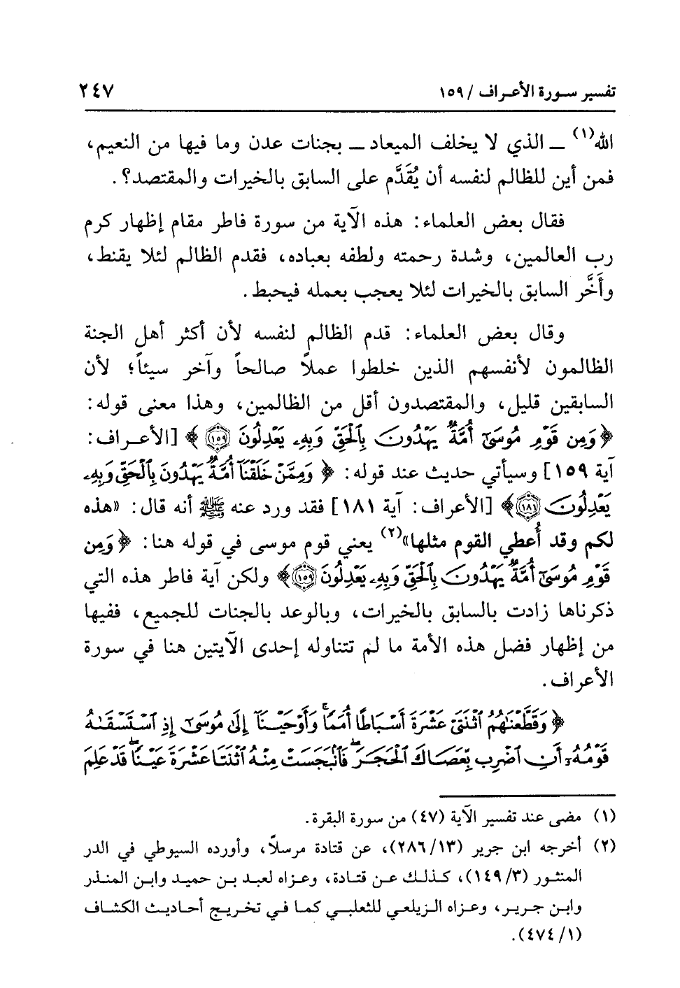 وقال بعض العلماء: قدم الظالم لنفسه لأن أكثر أهل الجنة الظالمون لأنفسهم الذين خلطوا عملاً صالحًا وآخر سيئًا؛ لأن السابقين قليل، والمقتصدون أقل من الظالمين، وهذا معنى قوله: {وَمِن قَوْمِ مُوسَى أُمَّةٌ يَهْدُونَ بِالْحَقِّ وَبِهِ يَعْدِلُونَ (159)} [الأعراف: آية 159] وسيأتي حديث عند قوله: {وَمِمَّنْ خَلَقْنَا أُمَّةٌ يَهْدُونَ بِالْحَقِّ وَبِهِ يَعْدِلُونَ (181)} [الأعراف: آية 181] فقد ورد عنه صلى الله عليه وسلم أنه قال: «هَذِهِ لَكُمْ وَقَدْ أُعْطِيَ القَوْمُ مِثْلَهَا» (¬2) يعني قوم موسى في قوله هنا: {وَمِن قَوْمِ مُوسَى أُمَّةٌ يَهْدُونَ بِالْحَقِّ وَبِهِ يَعْدِلُونَ} ولكن آية فاطر هذه التي ذكرناها زادت بالسابق بالخيرات، وبالوعد بالجنات للجميع، ففيها من إظهار فضل هذه الأمة ما لم تتناوله إحدى الآيتين هنا في سورة الأعراف.
