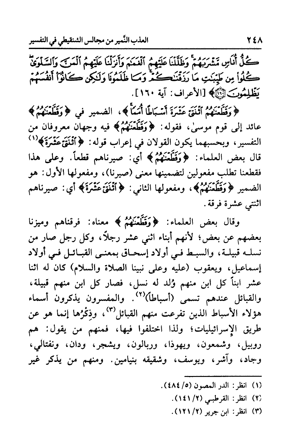 {وَقَطَّعْنَاهُمُ اثْنَتَيْ عَشْرَةَ أَسْبَاطًا أُمَمًا}، الضمير في {وَقَطَّعْنَاهُمُ} عائد إلى قوم موسى، فقوله: {وَقَطَّعْنَاهُمُ} فيه وجهان معروفان من التفسير، وبحسبهما يكون القولان في إعراب قوله: {اثْنَتَيْ عَشْرَةَ} (¬1) قال بعض العلماء: {وَقَطَّعْنَاهُمُ} أي: صَيَّرْنَاهم قطعًا. وعلى هذا فقطعنا تطلب مفعولين لتضمينها معنى (صيرنا)، ومفعولها الأول: هو الضمير {وَقَطَّعْنَاهُمُ}، ومفعولها الثاني: {اثْنَتَيْ عَشْرَةَ} أي: صيرناهم اثنتي عشرة فرقة.