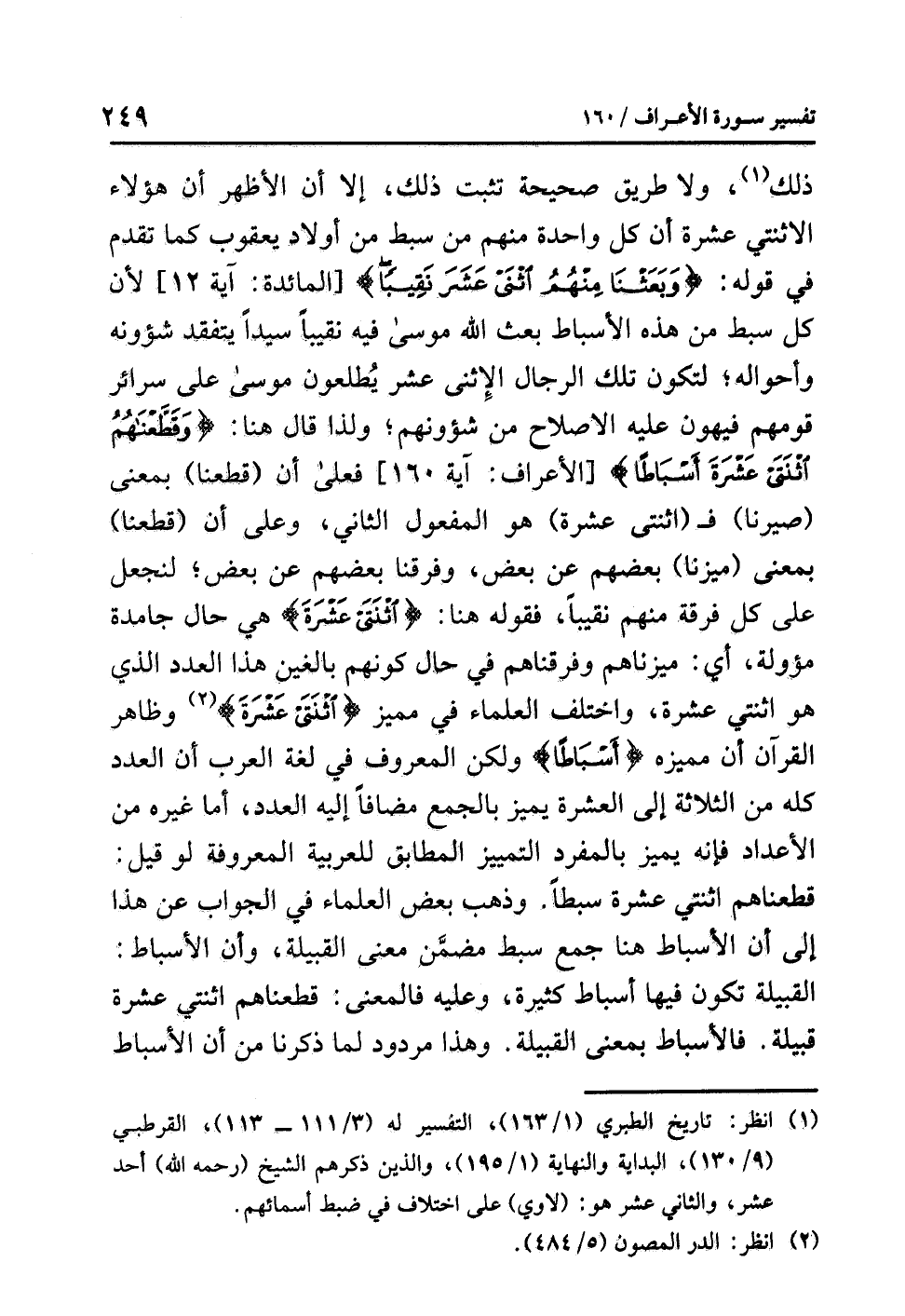 ذلك (¬1)، ولا طريق صحيحة تثبت ذلك، إلا أن الأظهر أن هؤلاء الاثنتي عشرة أن كل واحدة منهم من سبط من أولاد يعقوب كما تقدم في قوله: {وَبَعَثْنَا مِنهُمُ اثْنَيْ عَشَرَ نَقِيبًا} [المائدة: آية 12] لأن كل سبط من هذه الأسباط بعث الله موسى فيه نقيبًا سيدًا يتفقد شؤونه وأحواله؛ لتكون تلك الرجال الاثني عشر يُطلعون موسى على سرائر قومهم فيهون عليه الإصلاح من شؤونهم؛ ولذا قال هنا: {وَقَطَّعْنَاهُمُ اثْنَتَيْ عَشْرَةَ أَسْبَاطًا أُمَمًا} [الأعراف: آية 160] فعلى أن (قطعنا) بمعنى (صيرنا) فـ (اثنتى عشرة) هو المفعول الثاني، وعلى أن (قطعنا) بمعنى (ميزنا) بعضهم عن بعض، وفرقنا بعضهم عن بعض؛ لنجعل على كل فرقة منهم نقيبًا، فقوله هنا: {اثْنَتَيْ عَشْرَةَ} هي حال جامدة مؤولة، أي: ميزناهم وفرقناهم في حال كونهم بالغين هذا العدد الذي هو اثنتي عشرة، واختلف العلماء في مميز {اثْنَتَيْ عَشْرَةَ} (¬2)