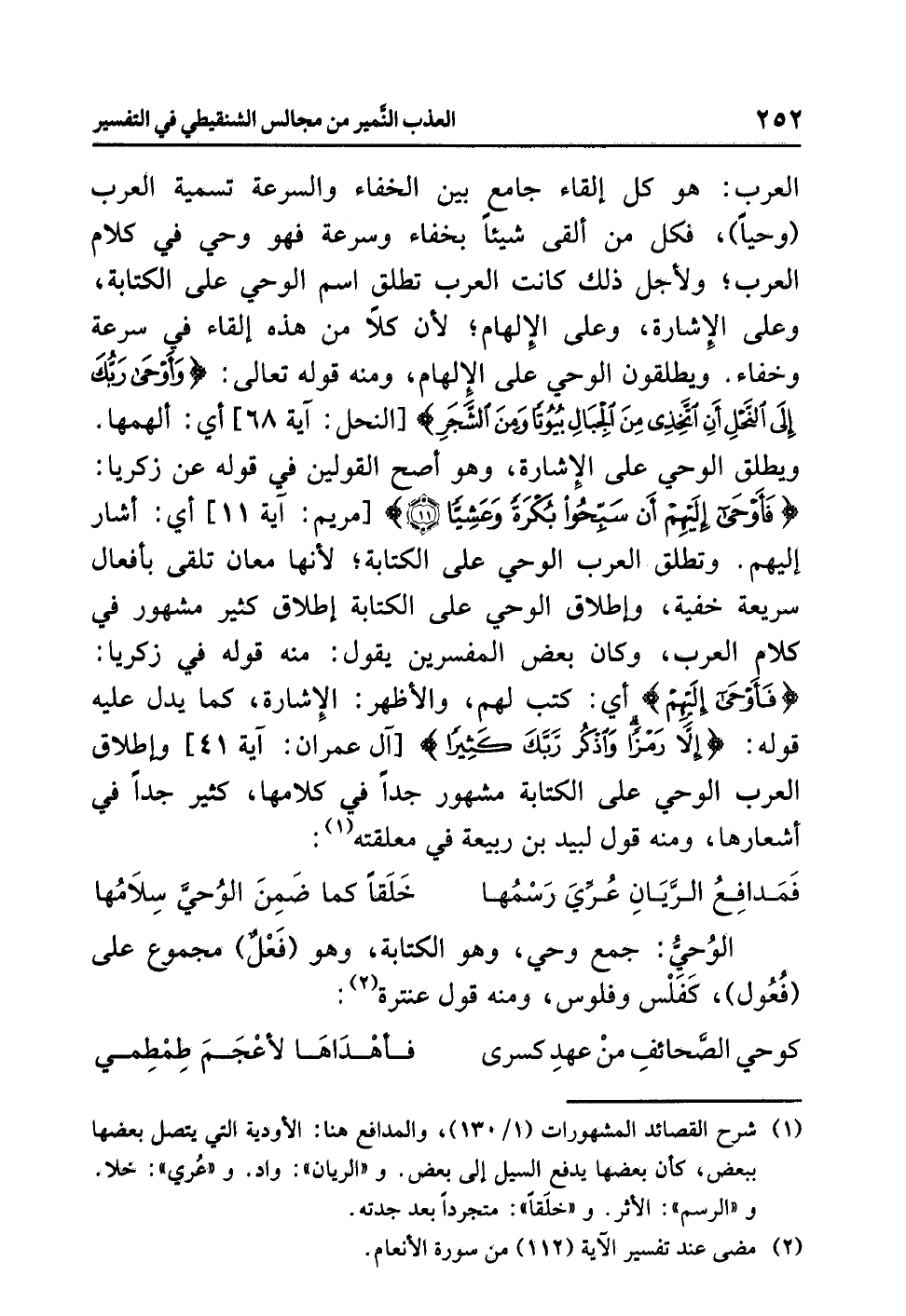 وتطلق العرب الوحي على الكتابة؛ لأنها معان تُلْقَى بِأَفْعَالٍ سَرِيعَةٍ خُفْيَةً، وإطلاق الوحي على الكتابة إطلاق كثير مشهور في كلام العرب، وكان بعض المفسرين يقول: منه قوله في زكريا: {فَأَوْحَى إِلَيْهِمْ} أي: كتب لهم، والأظهر: الإشارة، كما يدل عليه قوله: {إِلاَّ رَمْزًا * وَاذْكُر رَّبَّكَ كَثِيرًا} [آل عمران: آية 41] وإطلاق العرب الوحي على الكتابة مشهور جدًّا في كلامها، كثير جدًّا في أشعارها، ومنه قول لبيد بن ربيعة في معلقته (¬1):