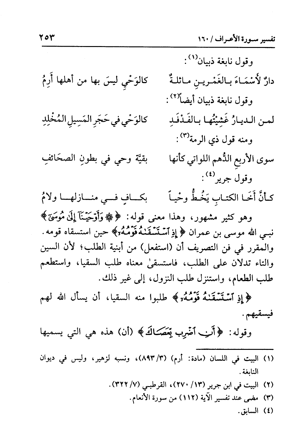 وهو كثير مشهور، وهذا معنى قوله: {وَأَوْحَيْنَا إِلَى مُوسَى} نبي الله موسى بن عمران {إِذِ اسْتَسْقَاهُ قَوْمُهُ} حين استسقاه قومه. والمقرر في فن التصريف أن (استفعل) من أبنية الطلب؛ لأن السين والتاء تدلان على الطلب، فاستسقى معناه طلب السقيا، واستطعم طلب الطعام، واستنزل طلب النزول، إلى غير ذلك.