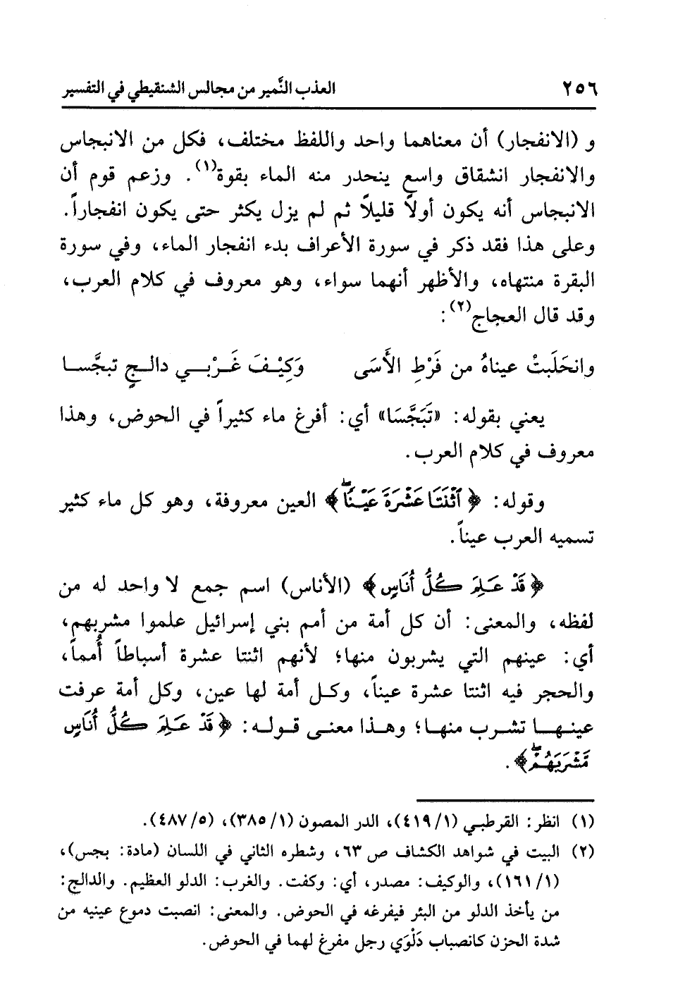 و (الانفجار) أن معناهما واحد واللفظ مختلف، فكل من الانبجاس والانفجار انشقاق واسع ينحدر منه الماء بقوة (¬1). وزعم قوم أن الانبجاس أنه يكون أولاً قليلاً ثم لم يزل يكثر حتى يكون انفجارًا. وعلى هذا فقد ذكر في سورة الأعراف بدء انفجار الماء، وفي سورة البقرة منتهاه، والأظهر أنهما سواء، وهو معروف في كلام العرب، وقد قال العجاج (¬2):