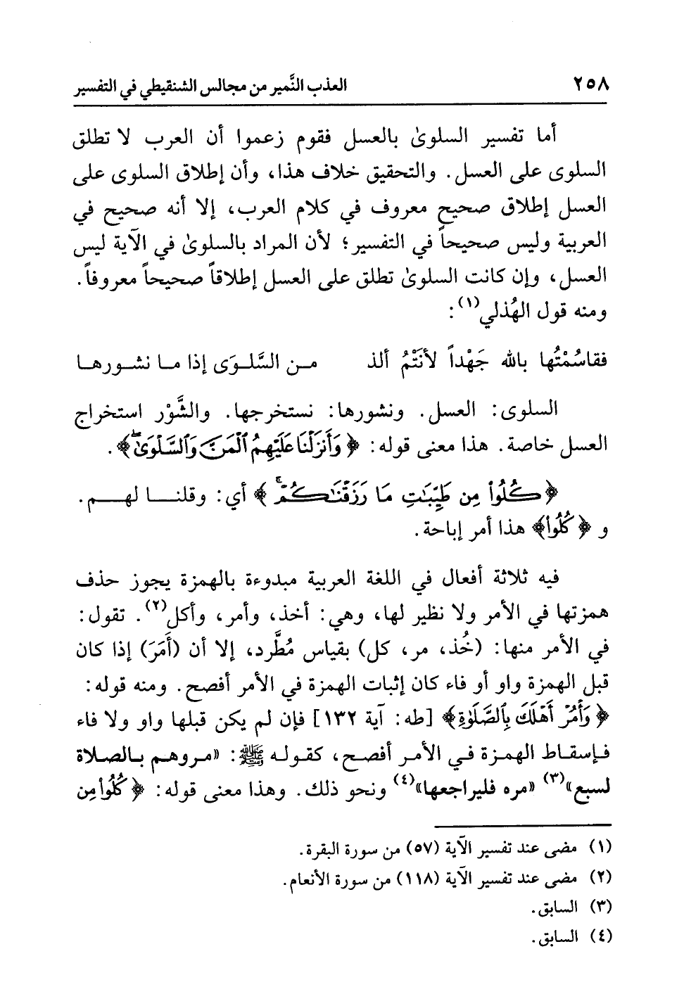 أما تفسير السلوى بالعسل فقوم زعموا أن العرب لا تطلق السلوى على العسل. والتحقيق خلاف هذا، وأن إطلاق السلوى على العسل إطلاق صحيح معروف في كلام العرب، إلا أنه صحيح في العربية وليس صحيحًا في التفسير؛ لأن المراد بالسلوى في الآية ليس العسل، وإن كانت السلوى تطلق على العسل إطلاقًا صحيحًا معروفًا. ومنه قول الهُذلي (¬1):