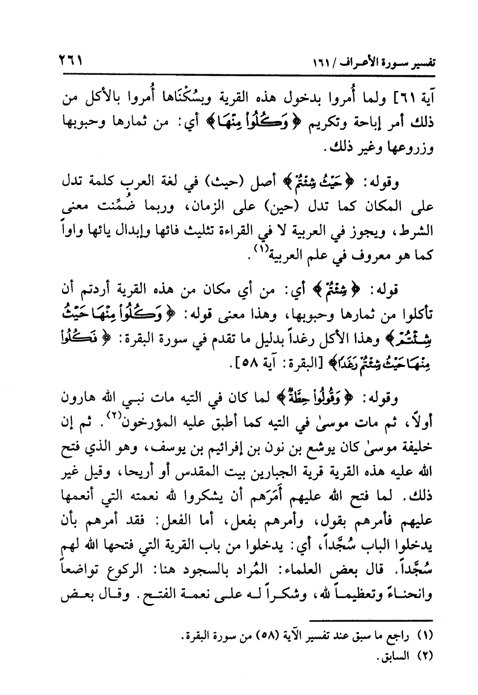 وقوله: {وَقُولُواْ حِطَّةٌ} لما كان في التيه مات نبي الله هارون أولاً، ثم مات موسى في التيه كما أطبق عليه المؤرخون (¬2). ثم إن خليفة موسى كان يوشع بن نون بن إفرائيم بن يوسف، وهو الذي فتح الله عليه هذه القرية قرية الجبارين بيت المقدس أو أريحا، وقيل غير ذلك. لما فتح الله عليهم أَمَرَهم أن يشكروا لله نعمته التي أنعمها عليهم فأمرهم بقول، وأمرهم بفعل، أما الفعل: فقد أمرهم بأن يدخلوا الباب سُجَّدًا، أي: يدخلوا من باب القرية التي فتحها الله لهم سُجَّدًا. قال بعض العلماء: المُراد بالسجود هنا: الركوع تواضعًا وانحناءً وتعظيمًا لله، وشكرًا له على نعمة الفتح. وقال بعض