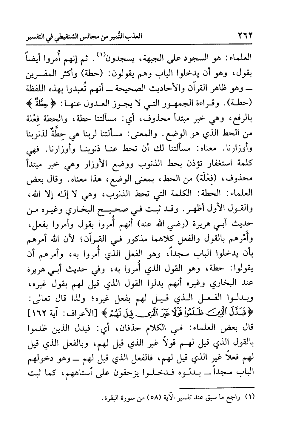 العلماء: هو السجود على الجَبْهَة، يسجدون (¬1). ثم إنهم أُمروا أيضًا بقول، وهو أن يدخلوا الباب وهم يقولون: (حطة) وأكثر المفسرين -وهو ظاهر القرآن والأحاديث الصحيحة- أنهم تُعبدوا بهذه اللفظة (حطة). وقراءة الجمهور التي لا يجوز العدول عنها: {حِطَّةٌ} بالرفع، وهي خبر مبتدأ محذوف، أي: مسألتنا حطة، والحطة فِعْلة من الحط الذي هو الوضع. والمعنى: مسألتنا لربنا هي حِطَّةٌ لذنوبنا وأوزارنا. معناه: مسألتنا لك أن تحط عنا ذنوبنا وأوزارنا، فهي كلمة استغفار تُؤْذِنُ بِحَطِّ الذنوب ووضع الأوزار، وهي خَبَر مبتدأ محذوف، (فِعْلَة) من الحط، بمعنى الوضع، هذا معناه. وقال بعض العلماء: الحطة: الكلمة التي تحط الذنوب، وهي لا إله إلا الله، والقول الأول أظهر.