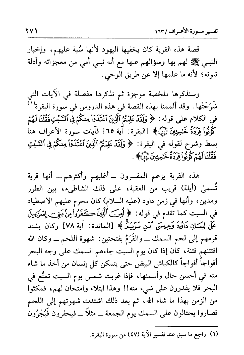 وسنذكرها ملخصة موجزة ثم نذكرها مفصلة في الآيات التي شَرَحَتْها. وقد ألممنا بهذه القصة في هذه الدروس في سورة البقرة (¬1) في الكلام على قوله: {وَلَقَدْ عَلِمْتُمُ الَّذِينَ اعْتَدَواْ مِنكُمْ فِي السَّبْتِ فَقُلْنَا لَهُمْ كُونُواْ قِرَدَةً خَاسِئِينَ (65)} [البقرة: آية 65] فآيات سورة الأعراف هنا بسط وشرح لقوله في البقرة: {وَلَقَدْ عَلِمْتُمُ الَّذِينَ اعْتَدَواْ مِنكُمْ فِي السَّبْتِ فَقُلْنَا لَهُمْ كُونُواْ قِرَدَةً خَاسِئِينَ (65)}.