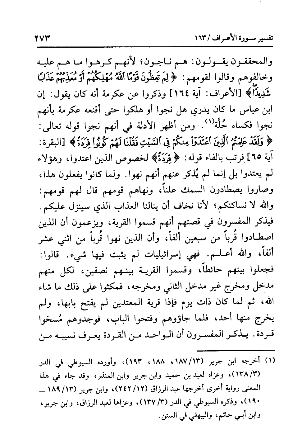 والمحققون يقولون: هم ناجون؛ لأنهم كرهوا ما هم عليه وخالفوهم وقالوا لقومهم: {لِمَ تَعِظُونَ قَوْمًا اللَّهُ مُهْلِكُهُمْ أَوْ مُعَذِّبُهُمْ عَذَابًا شَدِيدًا} [الأعراف: آية 164] وذكروا عن عكرمة أنه كان يقول: إن ابن عباس ما كان يدري هل نجوا أو هلكوا حتى أقنعه عكرمة بأنهم نجوا فكساه حُلَّة (¬1). ومن أظهر الأدلة في أنهم نجوا قوله تعالى: {وَلَقَدْ عَلِمْتُمُ الَّذِينَ اعْتَدَواْ مِنكُمْ فِي السَّبْتِ فَقُلْنَا لَهُمْ كُونُواْ قِرَدَةً} [البقرة: آية 65] فرتب بالفاء قوله: {قِرَدَةً} لخصوص الذين اعتدوا، وهؤلاء لم يعتدوا بل إنما لم يُذكر عنهم أنهم نهوا. ولما كانوا يفعلون هذا، وصاروا يصطادون السمك علنًا، ونهاهم قومهم قال لهم قومهم: والله لا نساكنكم؛ لأنا نخاف أن ينالنا العذاب الذي سينزل عليكم. فيذكر المفسرون في قصتهم أنهم قسموا القرية، ويزعمون أن الذين اصطادوا قُربًا من سبعين ألفًا، وأن الذين نهوا قُربًا من اثني عشر ألفًا، والله أعلم. فهي إسرائيليات لم يثبت فيها شيء. قالوا: فجعلوا بينهم حائطًا، وقسموا القرية بينهم نصفين، لكل منهم مدخل ومخرج غير مدخل الثاني ومخرجه، فمكثوا على ذلك ما شاء الله، ثم لما كان ذات يوم فإذا قرية المعتدين لم يفتح بابها، ولم يخرج منها أحد، فتسوروا عليهم الحائط فوجدوهم -والعياذ بالله- مُسخوا قردة.