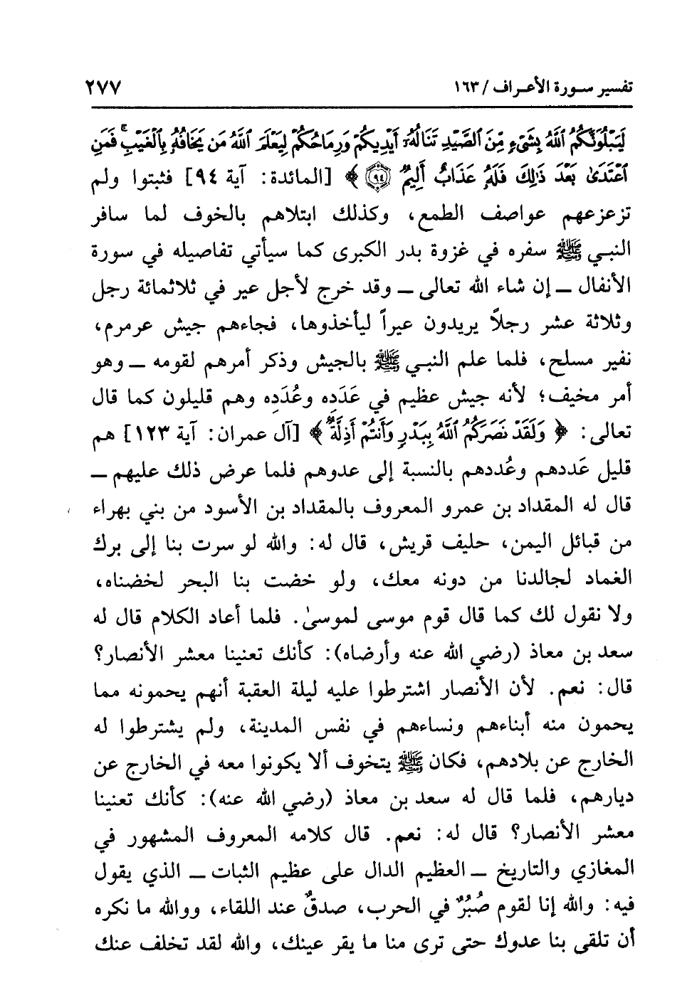 لَيَبْلوَنَّكُمُ اللَّهُ بِشيء مِّنَ الصَّيْدِ تَنَالُهُ أَيْدِيكُمْ وَرِمَاحُكُمْ لِيَعْلَمَ اللَّهُ مَن يَخَافُهُ بِالْغَيْبِ فَمَنِ اعْتَدَى بَعْدَ ذَلِكَ فَلَهُ عَذَابٌ أَلِيمٌ (94)} [المائدة: آية 94] فثبتوا ولم تزعزعهم عواصف الطمع، وكذلك ابتلاهم بالخوف لما سافر النبي صلى الله عليه وسلم سفره في غزوة بدر الكبرى كما سيأتي تفاصيله في سورة الأنفال -إن شاء الله تعالى- وقد خرج لأجل عير في ثلاثمائة رجل وثلاثة عشر رجلاً يريدون عيرًا ليأخذوها، فجاءهم جيش عرمرم، نفير مسلح، فلما علم النبي صلى الله عليه وسلم بالجيش وذكر أمرهم لقومه -وهو أمر مخيف؛ لأنه جيش عظيم في عَدَدِه وعُدَدِه وهم قليلون كما قال تعالى: {وَلَقَدْ نَصَرَكُمُ اللَّهُ بِبَدْرٍ وَأَنتُمْ أَذِلَّةٌ} [آل عمران: آية 123] هم قليل عَددهم وعُددهم بالنسبة إلى عدوهم فلما عرض ذلك عليهم- قال له المقداد بن عمرو المعروف بالمقداد بن الأسود من بني بهراء من قبائل اليمن، حليف قريش، قال له: والله لو سرت بنا إلى برك الغماد لجالدنا من دُونَهُ معك، ولو خضت بنا البحر لخضناه، ولا نقول لك كما قال قوم موسى لموسى فلما أعاد الكلام قال له سعد بن معاذ (رضي الله عنه وأرضاه): كأنك تعنينا معشر الأنصار؟ قال: نعم. لأن الأنصار اشترطوا عليه ليلة العقبة أنهم يحمونه مما يحمون منه أبناءهم ونساءهم في نفس المدينة، ولم يشترطوا له الخارج عن بلادهم، فكان صلى الله عليه وسلم يتخوف ألا يكونوا معه في الخارج عن ديارهم، فلما قال له سعد بن معاذ (رضي الله عنه): كأنك تعنينا معشر الأنصار؟ قال له: نعم. قال كلامه المعروف المشهور في المغازي والتاريخ -العظيم الدال على عظيم الثبات- الذي يقول فيه: والله إنا لقوم صُبُرٌ في الحرب، صُدَّقٌ عند اللقاء، ووالله ما نكره أن تلقى بنا عدوك حتى ترى منا ما يقر عينك، والله لقد تخلف عنك