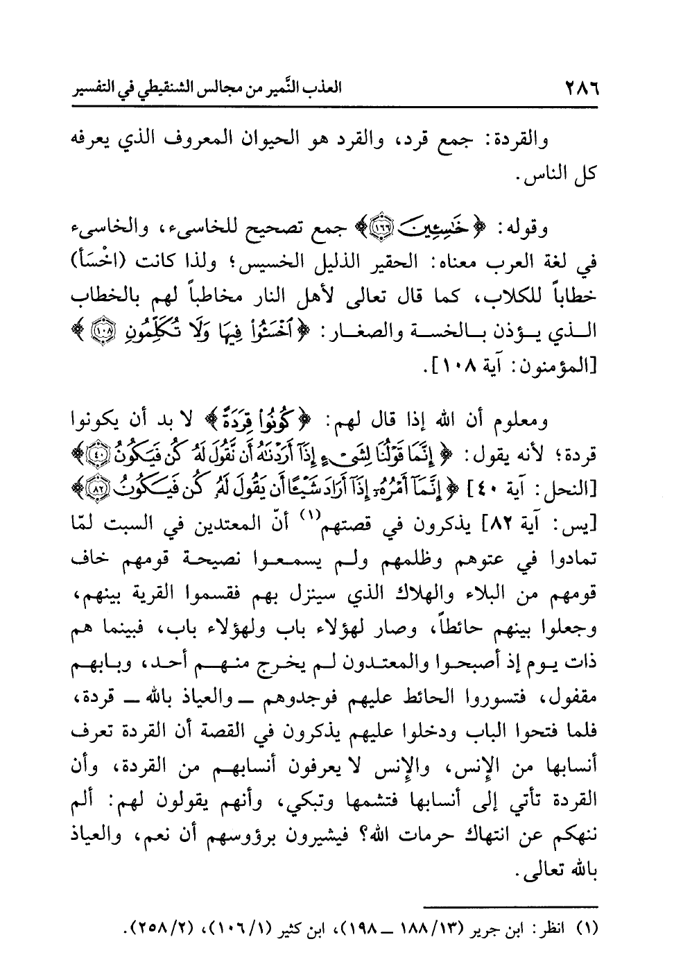 ومعلوم أن الله إذا قال لهم: {كُونُواْ قِرَدَةً} لا بد أن يكونوا قردة؛ لأنه يقول: {إِنَّمَا قَوْلُنَا لِشيء إِذَا أَرَدْنَاهُ أَن نَّقُولَ لَهُ كُن فَيَكُونُ (40)} [النحل: آية 40] {إِنَّمَا أَمْرُهُ إِذَا أَرَادَ شيئًا أَنْ يَقُولَ لَهُ كُنْ فَيَكُونُ (82)} [يس: آية 82] يذكرون في قصتهم (¬1) أنّ المعتدين في السبت لمّا تمادوا في عتوهم وظلمهم ولم يسمعوا نصيحة قومهم خاف قومهم من البلاء والهلاك الذي سينزل بهم فقسموا القرية بينهم، وجعلوا بينهم حائطًا، وصار لهؤلاء باب ولهؤلاء باب، فبينما هم ذات يوم إذ أصبحوا والمعتدون لم يخرج منهم أحد، وبابهم مقفول، فتسوروا الحائط عليهم فوجدوهم -والعياذ بالله- قردة، فلما فتحوا الباب ودخلوا عليهم يذكرون في القصة أن القردة تعرف أنسابها من الإنس، والإنس لا يعرفون أنسابهم من القردة، وأن القردة تأتي إلى أنسابها فتشمها وتبكي، وأنهم يقولون لهم: ألم ننهكم عن انتهاك حرمات الله؟ فيشيرون برؤوسهم أن نعم، والعياذ بالله تعالى.