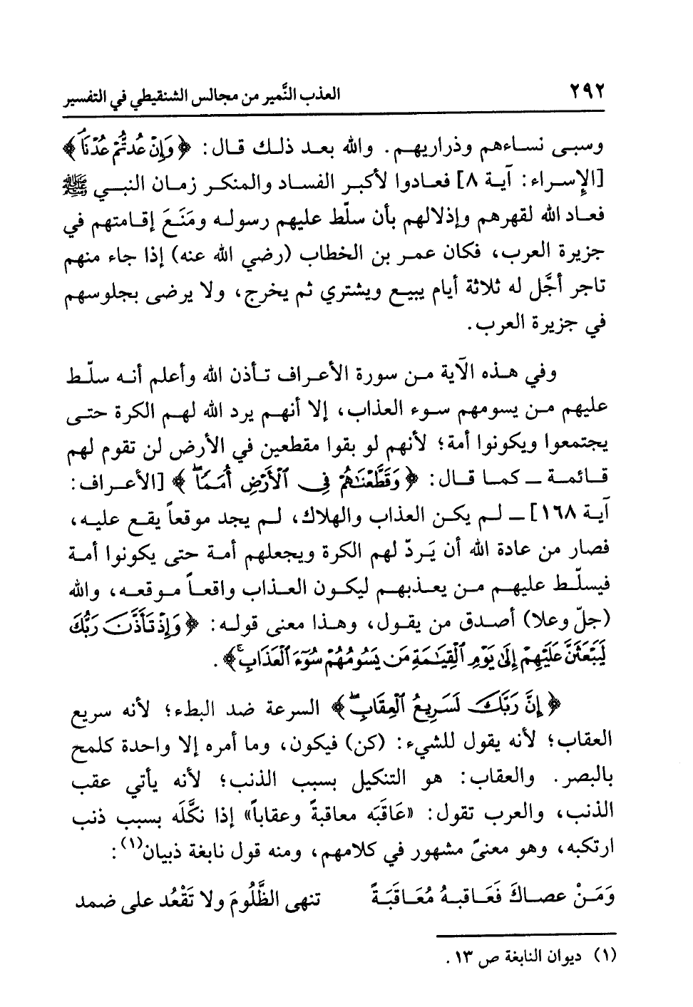 وفي هذه الآية من سورة الأعراف تأذن الله وأعلم أنه سلّط عليهم من يسومهم سوء العذاب، إلا أنهم يَرُدّ اللهُ لهُمُ الكَرَّةَ حتى يجتمعوا ويكونوا أمَّة؛ لأنهم لو بقوا مقطعين في الأرض لن تقوم لهم قائمة -كما قال: {وَقَطَّعْنَاهُمْ فِي الأَرْضِ أُمَمًا} [الأعراف: آية 168]- ولم يكن العذاب والهلاك، ولم يجد موقعًا يقع عليه، فصار من عادة الله أن يَردّ لهم الكَرَّةَ ويجعلهم أمة حتى يكونوا أمة فيسلّط عليهم من يعذبهم ليكون العذاب واقعًا موقعه، والله (جلّ وعلا) أصدق من يقول، وهذا معنى قوله: {وَإِذْ تَأَذَّنَ رَبُّكَ لَيَبْعَثَنَّ عَلَيْهِمْ إِلَى يَوْمِ الْقِيَامَةِ مَن يَسُومُهُمْ سُوءَ الْعَذَابِ}.