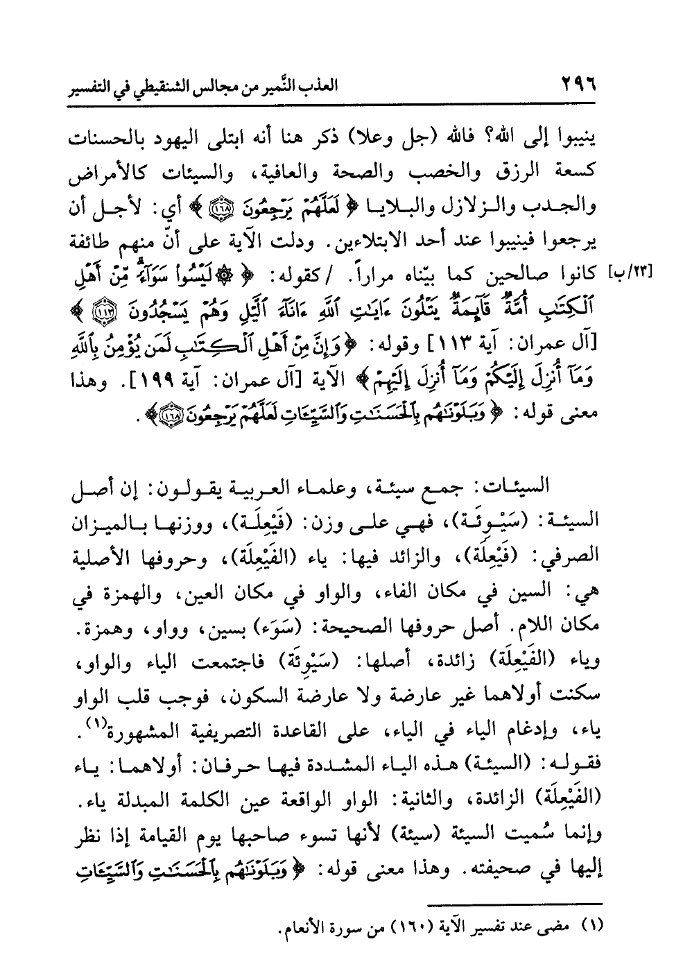 السيئات: جمع سيئة، وعلماء العربية يقولون: إن أصل السيئة: (سَيْوِئَة)، فهي على وزن: (فَيْعِلَة)، ووزنها بالميزان الصرفي: (فَيْعِلَة)، والزائد فيها: ياء (الفَيْعِلَة)، وحروفها الأصلية هي: السين في مكان الفاء، والواو في مكان العين، والهمزة في مكان اللام. أصل حروفها الصحيحة: (سَوَء) بسين، وواو، وهمزة. وياء (الفَيْعِلَة) زائدة، أصلها: (سَيْوِئَة) فاجتمعت الياء والواو، وسكنت أولاهما غير عارضة ولا عارضة السكون، فوجب قلب الواو ياء، وإدغام الياء في الياء، على القاعدة التصريفية المشهورة (¬1). فقوله: (السيئة) هذه الياء المشددة فيها حرفان: أولاهما: ياء (الفَيْعِلَة) الزائدة، والثانية: الواو الواقعة عين الكلمة المبدلة ياء. وإنما سُميت السيئة (سيئة) لأنها تسوء صاحبها يوم القيامة إذا نظر إليها في صحيفته. وهذا معنى قوله: {وَبَلَوْنَاهُمْ بِالْحَسَنَاتِ وَالسَّيِّئَاتِ