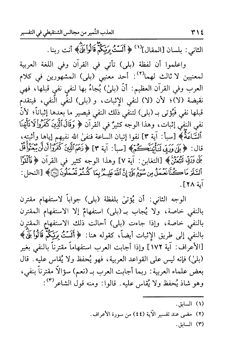 واعلموا أن لفظة (بلى) تأتي في القرآن وفي اللغة العربية لِمَعْنَيَيْنِ لا ثالث لهما (¬2): أحد معنيي (بلى) المشهورين في كلام العرب وفي القرآن العظيم: أنّ (بلى) يُجاءُ بها لنفي نفي قبلها، فهي نقيضة (لا)؛ لأن (لا) لنفي الإثبات، و (بلى) لنفي النفي، فَيتقدم قبلها نفي فَيُؤْتَى بـ (بلى) لتنفي ذلك النفي فيصير ما بعدها إثباتًا؛ لأنّ نفي النفي إثبات، وهذا الوجه كثيرٌ في القرآن {وَقَالَ الَّذِينَ كَفَرُوا لاَ تَأْتِينَا السَّاعَةُ} [سبأ: آية 3] نفوا إتيان الساعة فنفى الله نفيهم إياها وأثبته، قال: {قُلْ بَلَى وَرَبِّي لَتَأْتِيَنَّكُمْ} [سبأ: آية 3] {زَعَمَ الَّذِينَ كَفَرُوا أَن لَّن يُبْعَثُوا قُلْ بَلَى وَرَبِّي لَتُبْعَثُنَّ} [التغابن: آية 7] وهذا الوجه كثير في القرآن {فَأَلْقَوُاْ السَّلَمَ مَا كُنَّا نَعْمَلُ مِن سُوءٍ بَلَى إِنَّ اللَّهَ عَلِيمٌ بِمَا كُنتُمْ تَعْمَلُونَ} [النمل: آية 28].