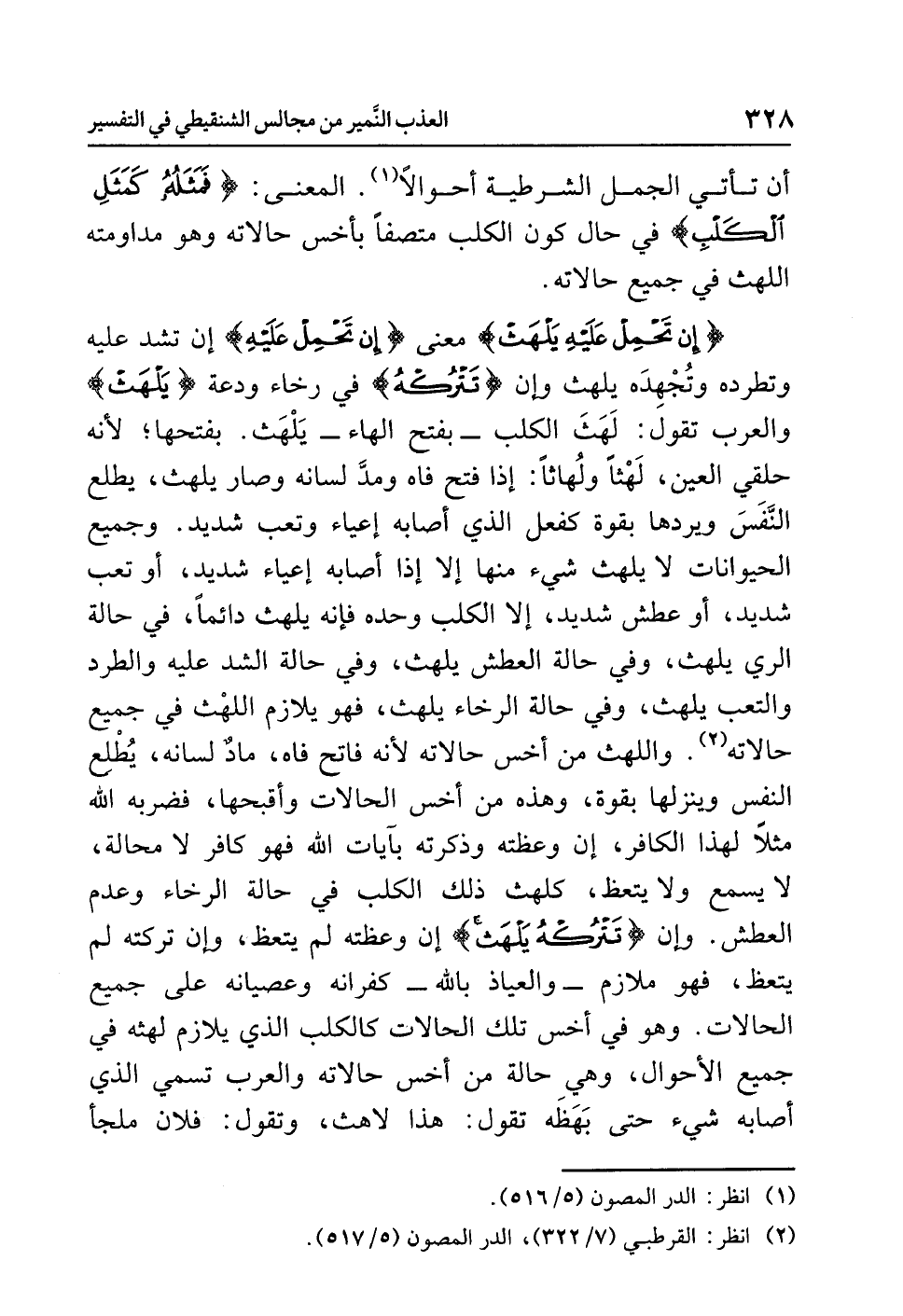 أَنْ تَأْتِيَ الجُمَل الشَّرْطِية أحوالاً (¬1). المعنى: {فَمَثَلُهُ كَمَثَلِ الْكَلْبِ} في حال كون الكلب مُتَّصِفًا بأخس حالاته وهو مُدَاوَمَتُهُ اللَّهْث في جميع حالاته.