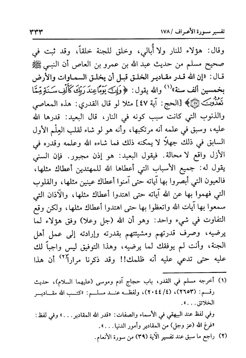 والله يقول: {وَإِنَّ يَوْمًا عِندَ رَبِّكَ كَأَلْفِ سَنَةٍ مِّمَّا تَعُدُّونَ} [الحج: آية 47] مثلاً لو قال القدري: هذه المعاصي والذنوب التي كانت سبب كونه في النار، قال البعيد: قدرها الله عليه، وسبق في علمه أنه مرتكبها، وأنه هو لو شاء لقلب العِلْم الأوَّل السابق في ذلك جهلاً لا يمكنه ذلك فما شاءه الله وعلمه وقدره في الأزل واقع لا محالة. فيقول البعيد: هو إذن مجبور. فإن السني يقول له: جميع الأسباب التي أعطاها الله للمهتدين أعطاك مثلها، فالعيون التي أبصروا بها آياته حتى آمنوا أعطاك عينين مثلها، والقلوب التي فهموا بها عن الله آياته حتى اهتدوا أعطاك مثلها، والآذان التي سمعوا بها آيات الله واتعظوا بها حتى اهتدوا أعطاك مثلها، ولكن وقع التفاوت في شيء واحد: وهو أن الله (جل وعلا) وفق هؤلاء لما يرضيه، وصرف قدرتهم ومشيئتهم بقدرته وإرادته إلى عمل أهل الجنة، وأنت لم يوفقك لما يرضيه، وهذا التوفيق ليس واجبًا لك عليه حتى تدعي عليه أنه ظلمك!! وقد ذكرنا مرارًا (¬2) أن هذا