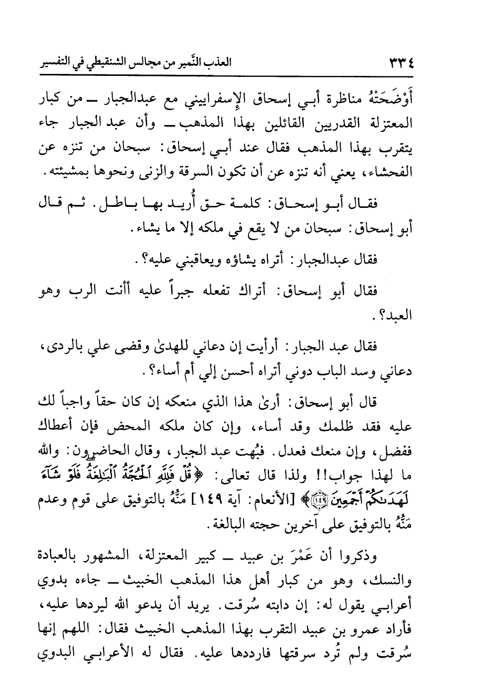 أَوْضَحَتْهُ مناظرة أبي إسحاق الإسفراييني مع عبد الجبار - من كبار المعتزلة القدريين القائلين بهذا المذهب - وأن عبد الجبار جاء يتقرب بهذا المذهب فقال عند أبي إسحاق: سبحان من تَنَزَّه عن الفحشاء! يعني أنه تَنَزَّهَ عن أن تكون السرقة والزنا ونحوها بمشيئته.