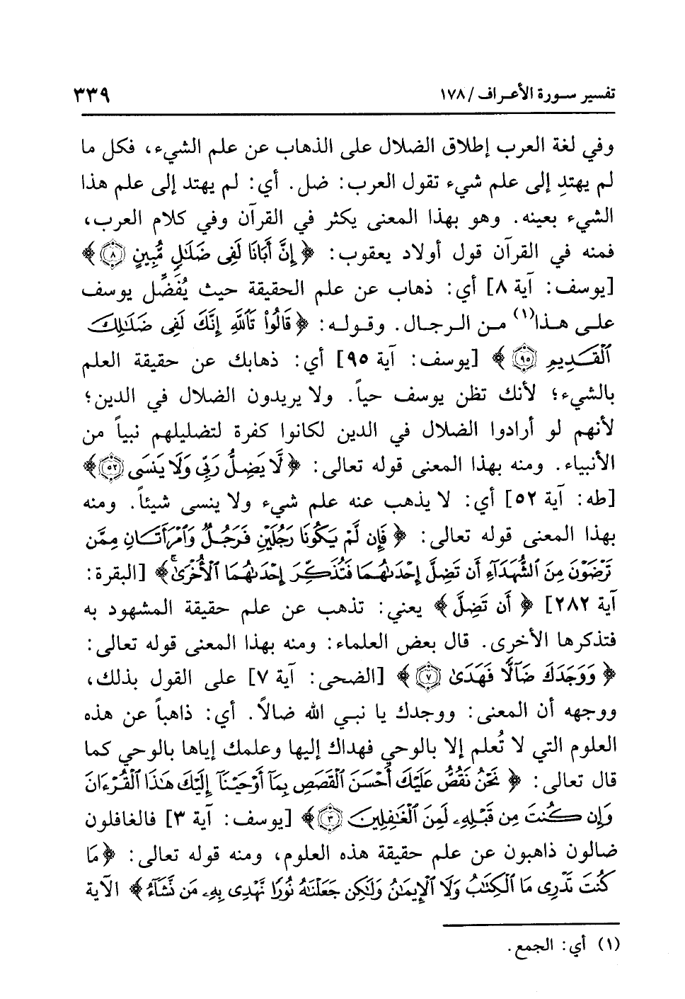 وفي لغة العرب إطلاق الضلال على الذهاب عن علم الشيء، فكل ما لم يهتدِ إلى علم شيء تقول العرب: ضل. أي: لم يهتد إلى علم هذا الشيء بعينه. وهو بهذا المعنى يكثر في القرآن وفي كلام العرب، فمنه في القرآن قول أولاد يعقوب: {إِنَّ أَبَانَا لَفِي ضَلاَلٍ مُّبِينٍ} [يوسف: آية 8] أي: ذهاب عن علم الحقيقة حيث يُفَضِّل يوسف على هذا (¬1) من الرجال. وقوله: {قَالُواْ تَاللَّهِ إِنَّكَ لَفِي ضَلاَلِكَ الْقَدِيمِ (95)} [يوسف: آية 95] أي: ذهابك عن حقيقة العلم بالشيء؛ لأنك تظن يوسف حيًّا، ولا يريدون الضلال في الدين؛ لأنهم لو أرادوا الضلال في الدين لكانوا كفرة لتضليلهم نبيًّا من الأنبياء. ومنه بهذا المعنى قوله تعالى: {لاَ يَضِلُّ رَبِّي وَلاَ يَنسَى} [طه: آية 52] أي: لا يذهب عنه علم شيء ولا ينسى شيئًا. ومنه بهذا المعنى قوله تعالى: {فَإِن لَّمْ يَكُونَا رَجُلَيْنِ فَرَجُلٌ وَامْرَأَتَانِ مِمَّن تَرْضَوْنَ مِنَ الشُّهَدَاء أَن تَضِلَّ إْحْدَاهُمَا فَتُذَكِّرَ إِحْدَاهُمَا الأُخْرَى} [البقرة: آية 282] {أَن تَضِلَّ} يعني: تذهب عن علم حقيقة المشهود به فتذكرها الأخرى. قال بعض العلماء: وأنه بهذا المعنى قوله تعالى: {وَوَجَدَكَ ضَالاً فَهَدَى (7)} [الضحى: آية 7] على القول بذلك، ووجهه أن المعنى: ووجدك يا نبي الله ضالاً؛ أي: ذاهبًا عن هذه العلوم التي لا تُعلم إلا بالوحي فهداك إليها وعلمك إياها بالوحي كما قال تعالى: {نَحْنُ نَقُصُّ عَلَيْكَ أَحْسَنَ الْقَصَصِ بِمَا أَوْحَيْنَا إِلَيْكَ هَذَا الْقُرْآنَ وَإِن كُنتَ مِن قَبْلِهِ لَمِنَ الْغَافِلِينَ (3)} [يوسف: آية 3] فالغافلون ضالون ذاهبون عن علم حقيقة هذه العلوم، ومنه قوله تعالى: {مَا كُنتَ تَدْرِي مَا الْكِتَابُ وَلاَ الإِيمَانُ وَلَكِن جَعَلْنَاهُ نُورًا نَّهْدِي بِهِ مَنْ نَّشَاء} الآية