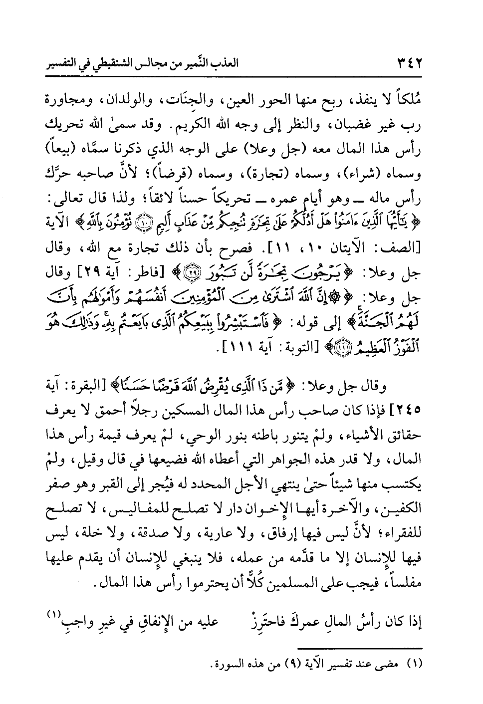 مُلكًا لا ينفذ، ربح منها الحور العين والجنات والولدان، ومجاورة رب غير غضبان، والنظر إلى وجه الله الكريم. وقد سمى الله تحريك رأس هذا المال معه (جل وعلا) على الوجه الذي ذكرنا سمّاه (بيعًا) وسَمَّاهُ (شِرَاءً)، وسَمَّاهُ (تجارة)، وسماه (قَرْضًا)؛ لأنّ صاحبه حرّك رأس ماله -وهو أيام عمره - تحريكًا حسنًا لائقًا؛ ولذا قال تعالى: {يَا أَيُّهَا الَّذِينَ آَمَنُوا هَلْ أَدُلُّكُمْ عَلَى تِجَارَةٍ تُنجِيكُم مِّنْ عَذَابٍ أَلِيمٍ (10) تُؤْمِنُونَ بِاللَّهِ} الآية [الصف: الآيتان 10، 11].