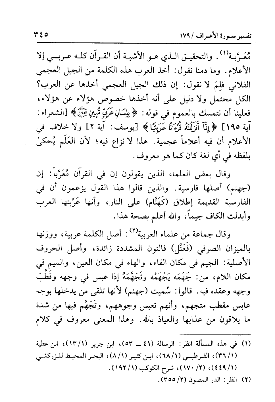 مُعَرَّبة (¬1). والتحقيق الذي هو الأشبة أن القرآن كله عربي إلا الأعلام. وما دمنا نقول: أخذ العرب هذه الكلمة من الجيل العجمي الفلاني فلِمَ لا نقول: إن ذلك الجيل الأعجمي أخذها عن العرب؟ الكل محتمل ولا دليل على أنه أخذها خصوص هؤلاء عن هؤلاء، فعلينا أن نتمسك بالعموم في قوله: {بِلِسَانٍ عَرَبِيٍّ مُّبِينٍ (195)} [الشعراء: آية 195] {إِنَّا أَنزَلْنَاهُ قُرْآنًا عَرَبِيًّا} [يوسف: آية 2] ولا خلاف في الأعلام أن فيه أعلامًا عجمية. هذا لا نزاع فيه؛ لأن العَلَم يُحكى بلفظه في أي لغة كان كما هو معروف.