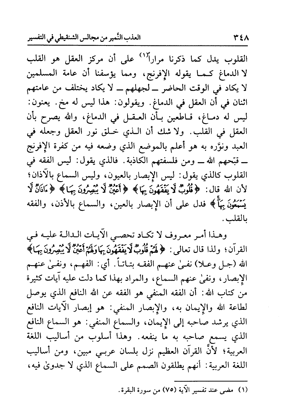 القلوب يدل كما ذكرنا مرارًا (¬1) على أن مركز العقل هو القلب لا الدماغ كما يقوله الإفرنج، ومما يؤسفنا أن عامة المسلمين لا يكاد في الوقت الحاضر- لجهلهم - لا يكاد يختلف من عامتهم اثنان في أن العقل في الدماغ. ويقولون: هذا ليس له مخ. يعنون: ليس له دماغ، قاطعين بأن العقل في الدماغ، والله يصرح بأن العقل في القلب. ولا شك أن الذي خلق نور العقل وجعله في العبد ونوَّره به هو أعلم بالموضع الذي وضعه فيه مِنْ كَفَرَةِ الإفْرِنْج -قبَّحهم الله- ومن فلسفتهم الكاذبة. فالذي يقول: ليس الفقه في القلوب كالذي يقول: ليس الإبصار بالعيون، وليس السماع بالآذان؛ لأن الله قال: {قُلُوبٌ لاَّ يَفْقَهُونَ بِهَا} {أَعْيُنٌ لاَّ يُبْصِرُونَ بِهَا} {آذَانٌ لاَّ يَسْمَعُونَ بِهَا} فدل على أن الإبصار بالعين، والسماع بالأذن، والفقه بالقلب.