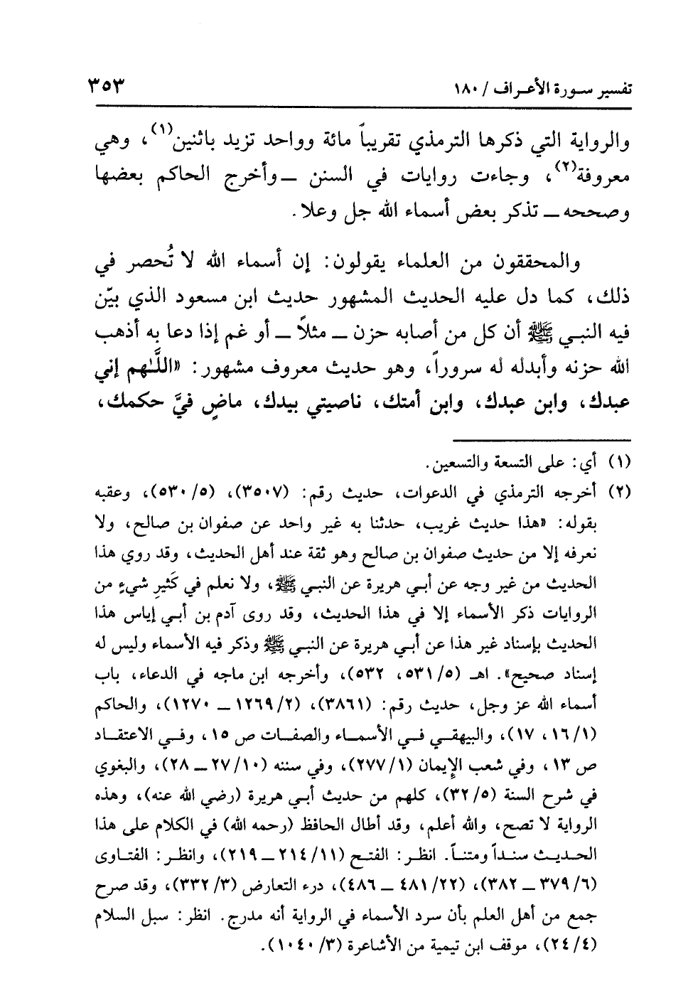 والمحققون من العلماء يقولون: إن أسماء الله لا تُحصر في ذلك، كما دل عليه الحديث المشهور حديث ابن مسعود الذي بيّن فيه النبي صلى الله عليه وسلم أن كل من أصابه حزن -مثلاً- أو غم إذا دعا به أَذْهَبَ اللهُ حُزْنَهُ وأبْدَلَهُ له سرورًا، وهو حديث معروف مشهور: «اللَّهُمَّ إِنِّي عَبْدُكَ، وَابْنُ عَبْدِكَ، وَابْنُ أَمَتِكَ، نَاصِيَتِي بِيَدِكَ، مَاضٍ فِي حُكْمُكَ،