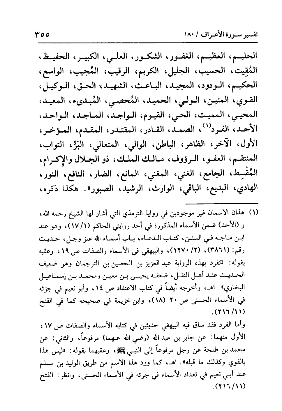 (¬1) هذان الاسمان غير موجودين في رواية الترمذي التي أشار لها الشيخ رحمه الله. و (الأحد) ضمن الأسماء المذكورة في أحد روايتي الحاكم (1/ 17)، وهو عند ابن ماجه في السنن، كتاب الدعاء، باب أسماء الله عز وجل. حديث رقم: (3861)، (2/ 1270)، والبيهقي في الأسماء والصفات ص19، وعقبه بقوله: «تفرد بهذه الرواية عبد العزيز بن الحصين بن الترجمان وهو ضعيف الحديث عند أهل النقل، ضعفه يحيى بن معين ومحمد بن إسماعيل البخاري» اهـ. وأخرجه أيضًا في كتاب الاعتقاد ص14. وأبو نعيم في جزئه في الأسماء الحسنى ص20 (18)، وابن خزيمة في صحيحه كما في الفتح (11/ 216).