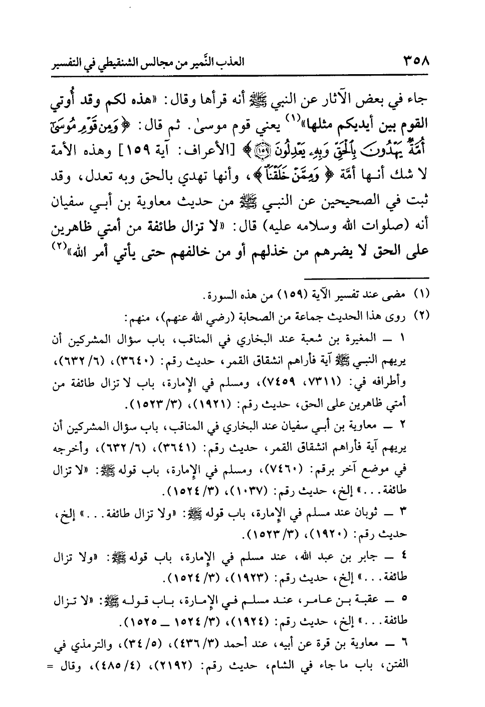جاء في بعض الآثار عن النبي صلى الله عليه وسلم أنه قرأها وقال: «هَذِهِ لَكُمْ وَقَدْ أُوتِيَ القَوْمُ بَيْنَ أيدِيكُمْ مِثْلَهَا» (¬1) يعني قوم موسى. ثم قال: {وَمِن قَوْمِ مُوسَى أُمَّةٌ يَهْدُونَ بِالْحَقِّ وَبِهِ يَعْدِلُونَ (159)} [الأعراف: آية 159] وهذه الأمة لا شك أنها أمَّة {وَمِمَّنْ خَلَقْنَا}، وأنها تهدي بالحق وبه تعدل، وقد ثبت في الصحيحين عن النبي صلى الله عليه وسلم من حديث معاوية بن أبي سفيان أنه (صلوات الله وسلامه عليه) قال: «لاَ تَزَالُ طَائِفَةٌ مِنْ أُمَّتِي ظَاهِرِينَ عَلَى الحَقِّ لاَ يَضُرُّهُمْ مَنْ خَذَلهُمْ أَوْ مَنْ خَالَفَهُمْ حَتَّى يَأْتِي أَمْرُ اللهِ» (¬2)