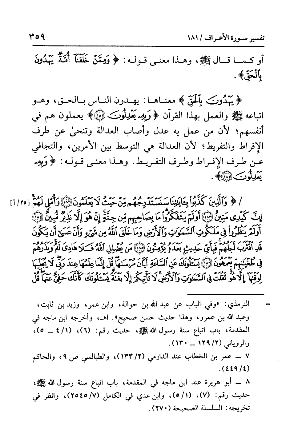 {يَهْدُونَ بِالْحَقِّ} لا معناها: يهدون الناس بالحق، وهو اتباعه صلى الله عليه وسلم والعمل بهذا القرآن {وَبِهِ يَعْدِلُونَ} يعملون هم في أنفسهم؛ لأن من عمل به عدل وأصاب العدالة وتنحى عن طرف الإفراط والتفريط؛ لأن العدالة هي التوسط بين الأمرين، والتجافي عن طرف الإفراط وطرف التفريط. وهذا معنى قوله: {وَبِهِ يَعْدِلُونَ}.