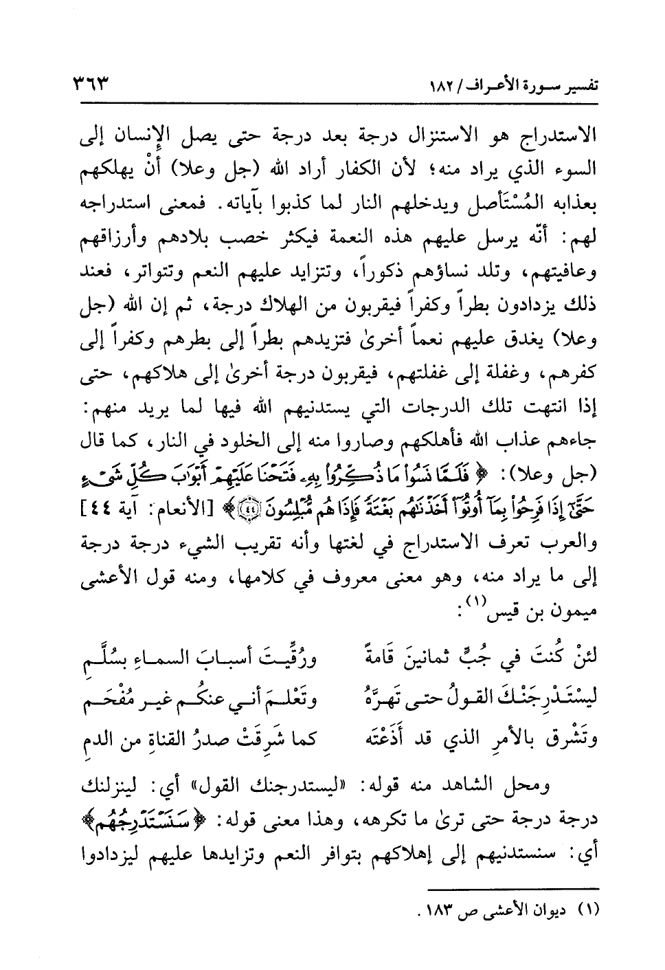 ومحل الشاهد منه قوله: «ليستدرجنك القول» أي: لينزلنك درجة درجة حتى ترى ما تكرهه، وهذا معنى قوله: {سَنَسْتَدْرِجُهُم} أي: سنستدنيهم إلى إهلاكهم بتوافر النعم وتزايدها عليهم ليزدادوا