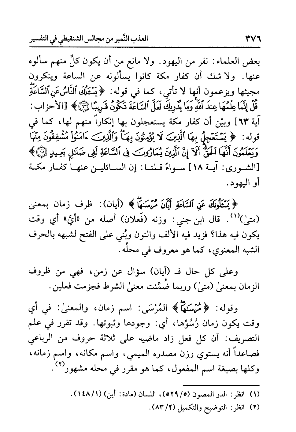 {يَسْأَلُونَكَ عَنِ السَّاعَةِ أَيَّانَ مُرْسَاهَا} (أيان): ظرف زمان بمعنى (متى) (¬1). قال ابن جني: وزنه (فَعلان) أصله من «أيَّ» أي وقت يكون فيه هذا؟ فزيد فيه الألف والنون وبُني على الفتح لشبهه بالحرف الشبه المعنوي، كما هو معروف في محلِّه.